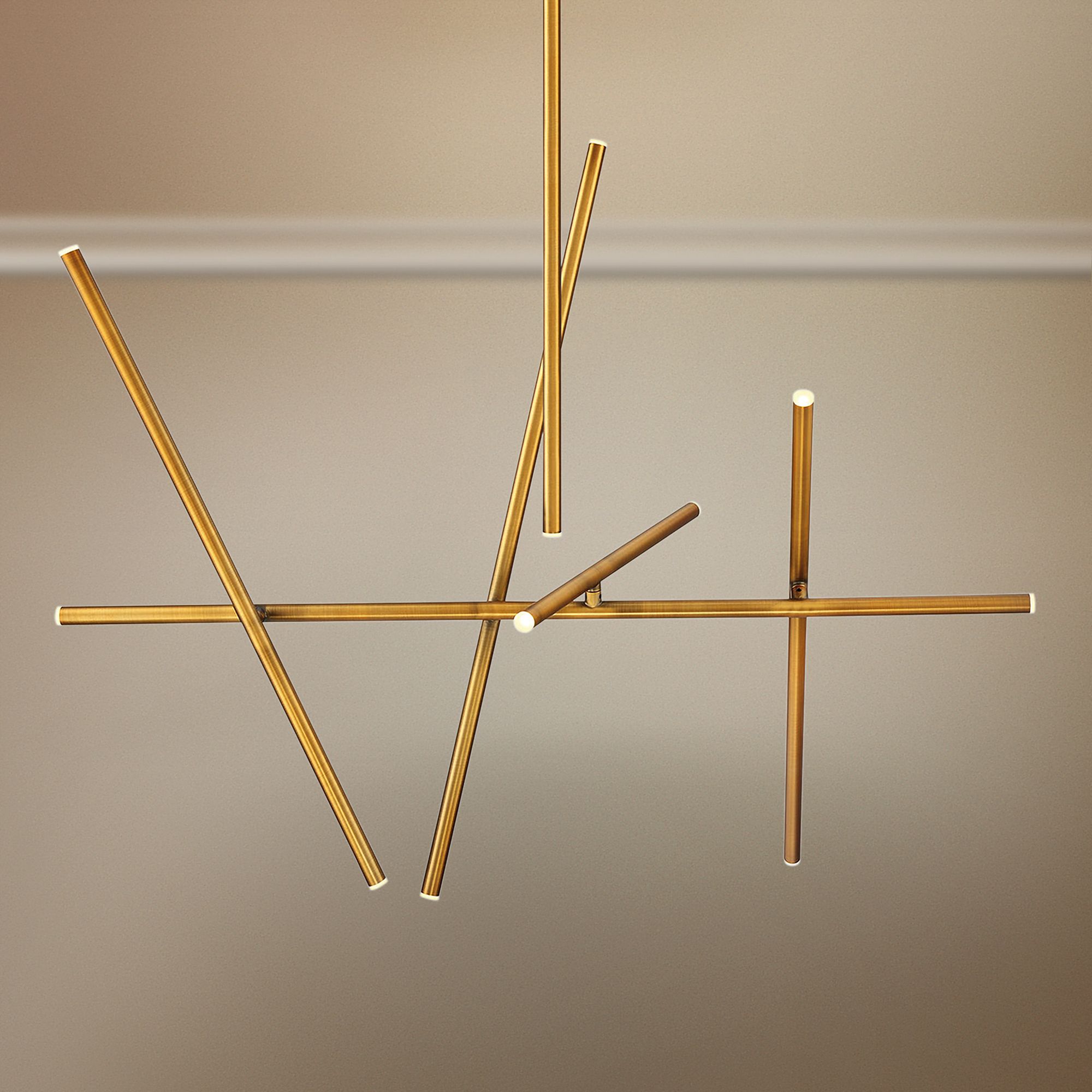 Low-key with a minimalist silhouette, this modern LED pendant light is also a study in art and architecture. Add visual interest to a contemporary space with this ten-light pendant from the Crossroads collection by Eurofase. Rich antique brass finish metal construction joins straight rods intersecting randomly, forming a light emulation of the iconic game of pickup-sticks. Adjustable arms and acrylic diffusers round out the list of features in this energy-efficient fixture, which is hardwire connected.