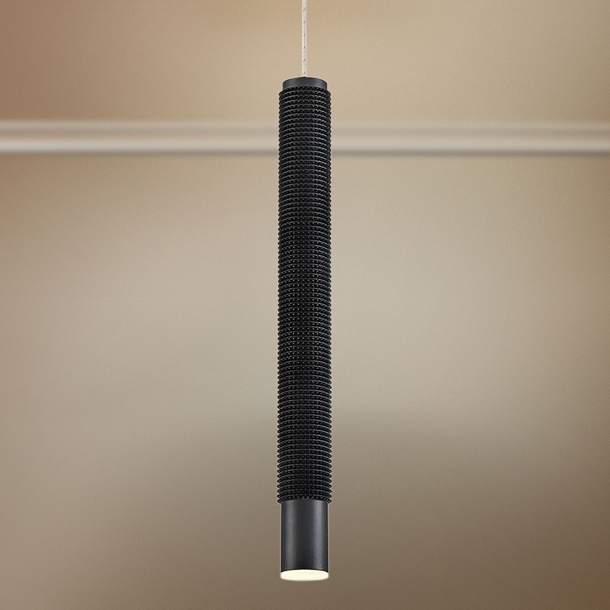 A bold black finish saturates the metal construction of this sleek, subtle, and modern LED mini pendant light from the Davenport collection by Eurofase. A vertical orientation highlights the delicate look of an artful fixture designed to send targeted ambient lighting into a contemporary compact space. With a spiked texture and frosted acrylic diffuser, it's a complete package. This mini-pendant is energy-efficient and hardwire connected.
