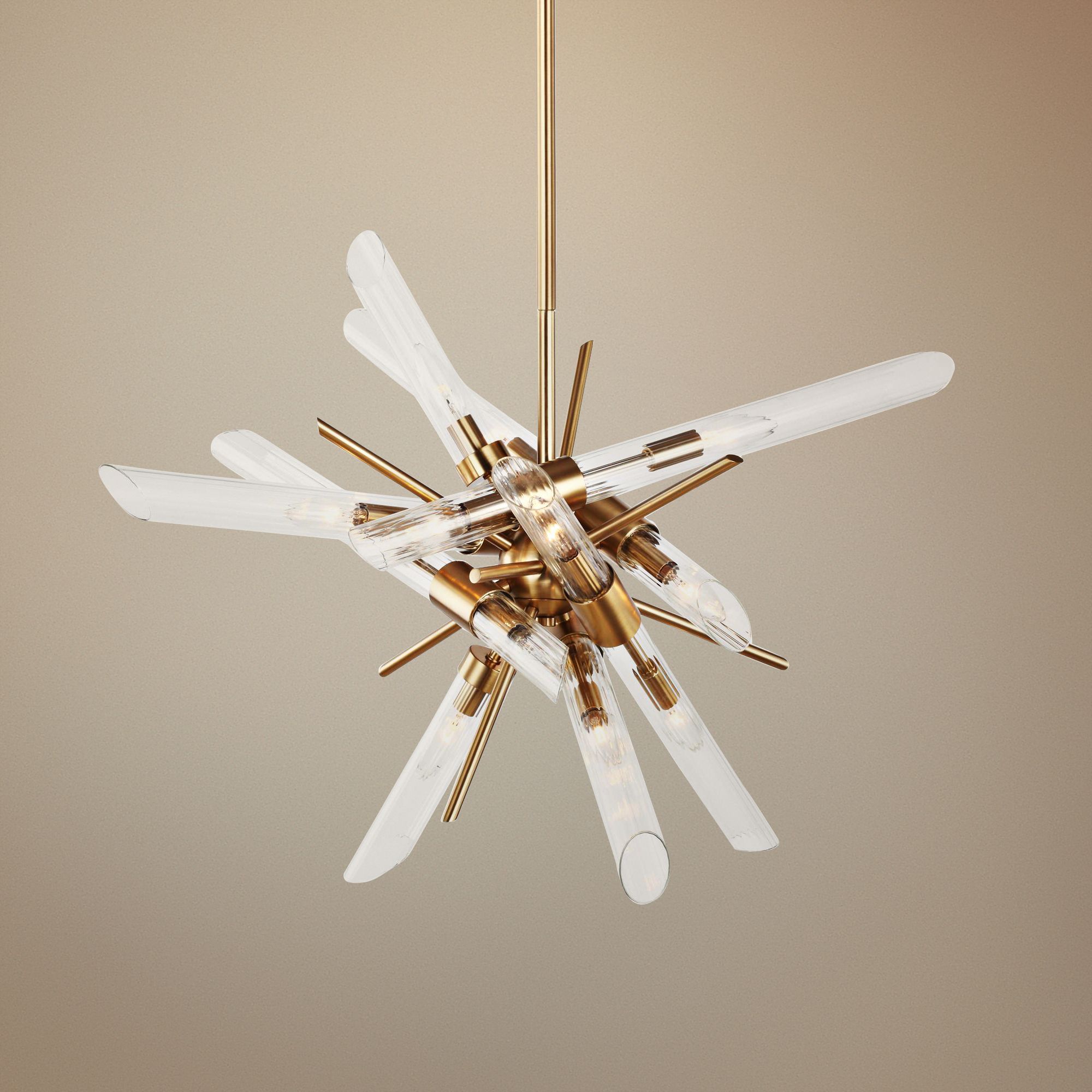 This medium, contemporary, fourteen-light chandelier has the dynamic shape of a sculptural, asymmetric starburst. Made with steel rods in burnished brass finish and clear fluted glass piping, For an even more dramatic effect, install multiples at varying heights. A 90-degree one-way swivel canopy makes sloped ceiling installation easy. Recommended for use with torpedo style candelabra base bulbs (sold separately).