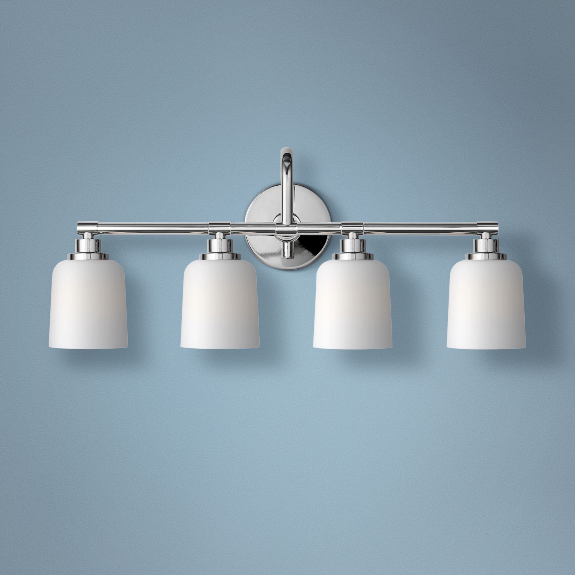 Elegantly illuminate your home with this contemporary four-light bath light from Feiss. Its chrome finish steel frame, mounted to a round backplate, stylishly supports beautiful white opal etched glass shades. This sophisticated lamp can conveniently be mounted up or down.
