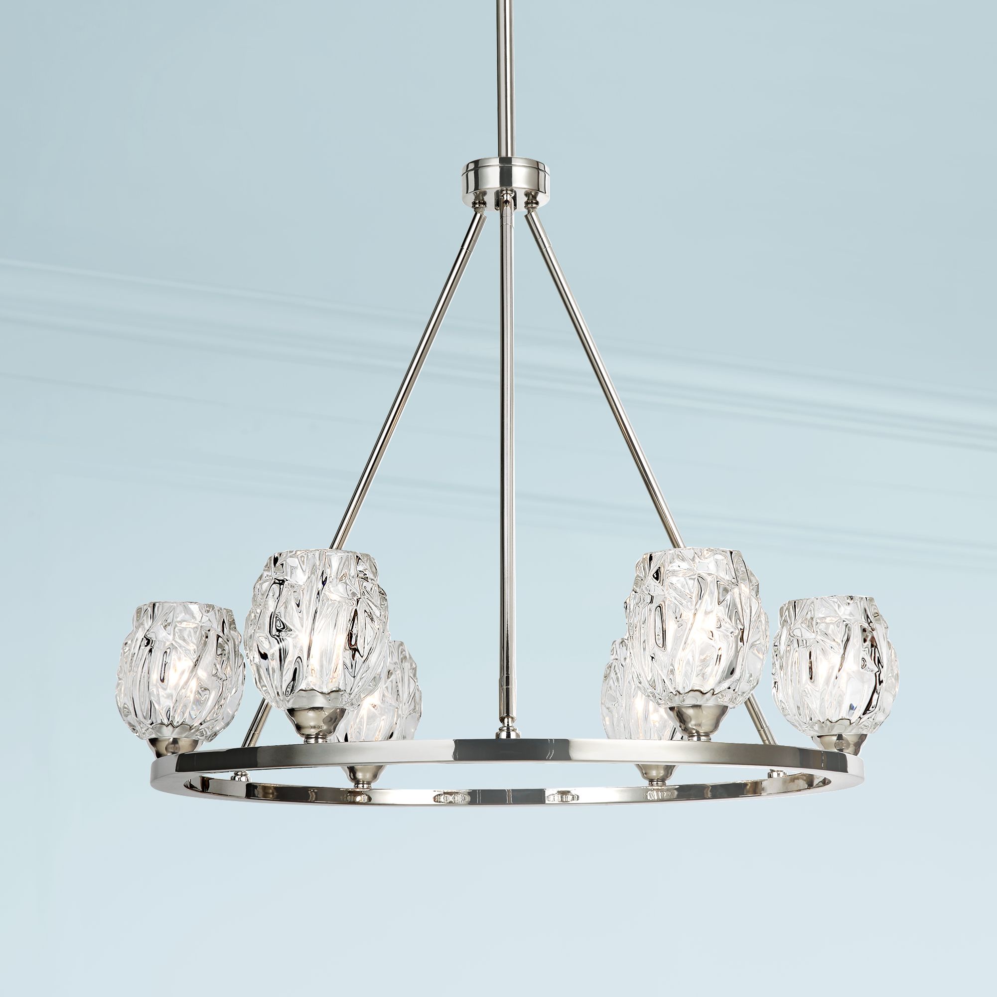 Constructed of steel and created to make a lasting impression on your decor, this six-light polished nickel chandelier features clean, contemporary lines and a classic ring framework. The elegant votive shades are made of faceted crystal clear glass with polished nickel trim. Recommended for use with torpedo style candelabra base bulbs (sold separately).