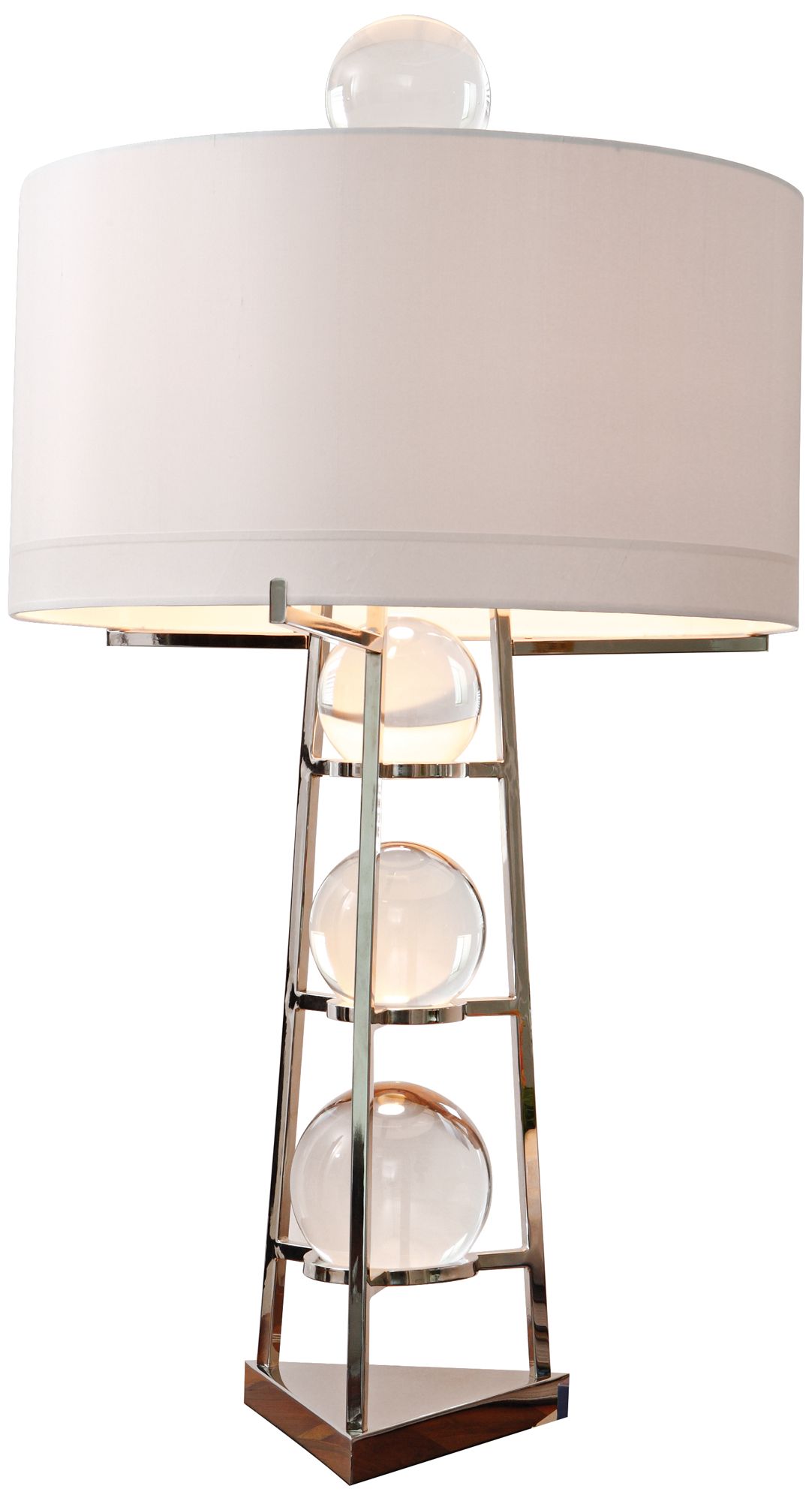 A quartet of crystal ball accents deliver rich elegance to this contemporary metal table lamp. Perfect for a console or other large tabletop, this lamp features a trio of graduated crystal balls in the base with a final orb finial above a round ivory hardback shade. The metal base is finished in nickel and polished stainless steel, reinforcing the modern aesthetic of this eye-catching lighting piece.
