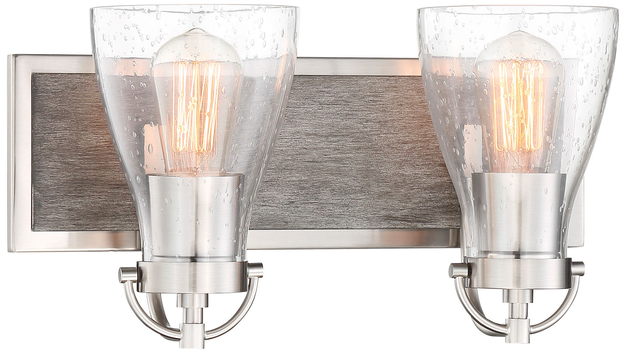 Put an elegant touch on your wall lighting with this industrial two-light wall sconce from the Garrison collection by Minka Lavery. It gleams with a brushed nickel finish over steel construction and clear seeded glass shades, while a shale wood inner plate adds a rustic touch. Install it with the lights pointing up or down in a hallway, den, or living room to suit your tastes.