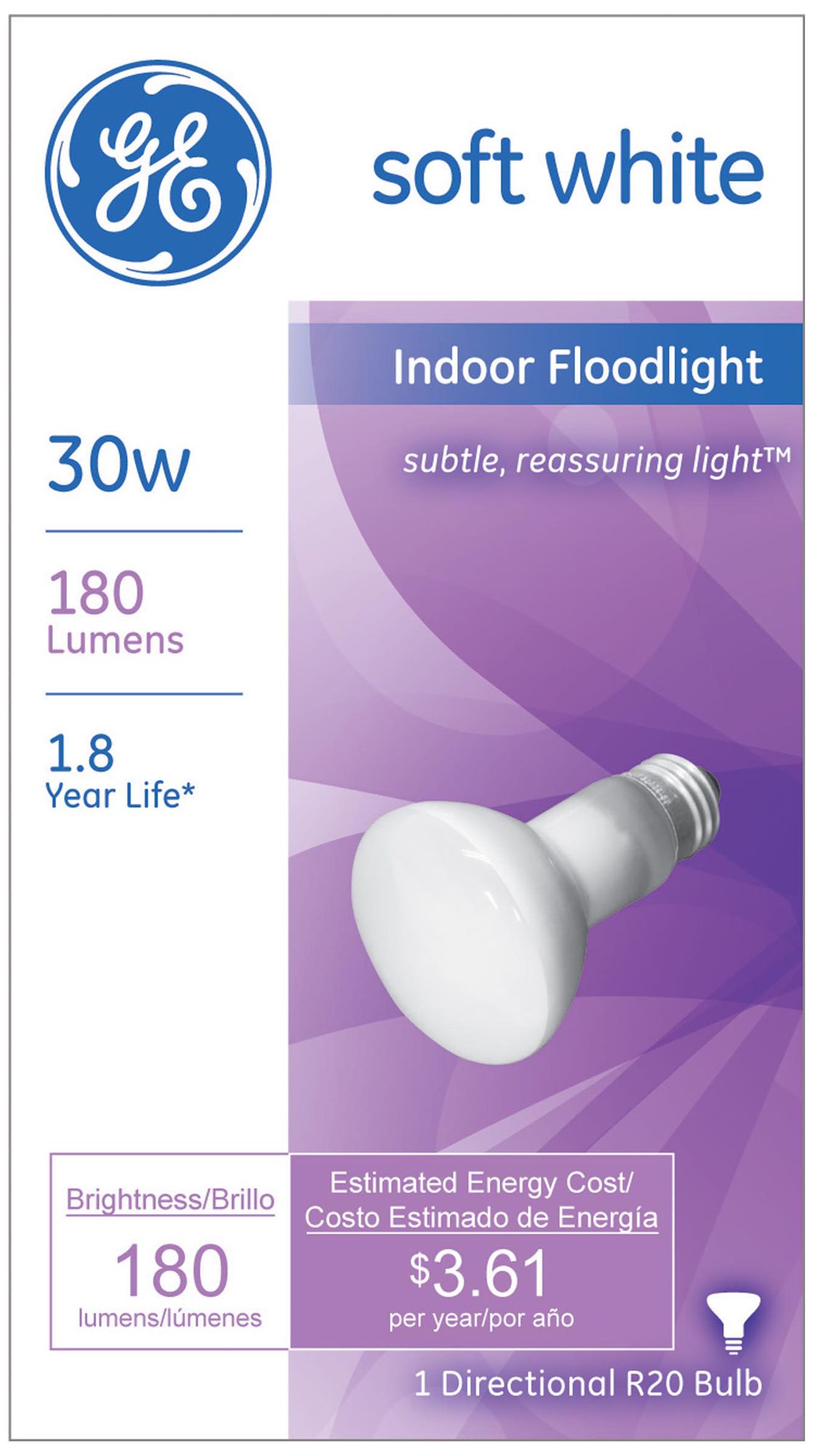 30-watt R-20 indoor light bulb. Reflector type light bulb is ideal for track and recessed lighting applications. Each bulb has a average life of up to 2000 hours. 200 lumens. By General Electric, GE. One bulb per package. Price is for one bulb.