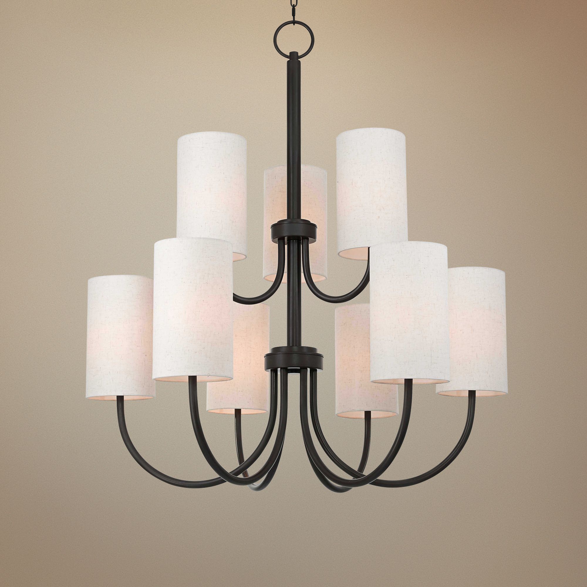 Add an Art Deco flavor to transitional decor with this decadent foyer chandelier. A double-layer frame made from English bronze finish steel delivers ornate curves that suspend nine oatmeal fabric hardback cylinder shades in a circular silhouette. Personality and artistic elegance remain a central focus in a main living or entry area. This foyer chandelier is suitable for damp locations.