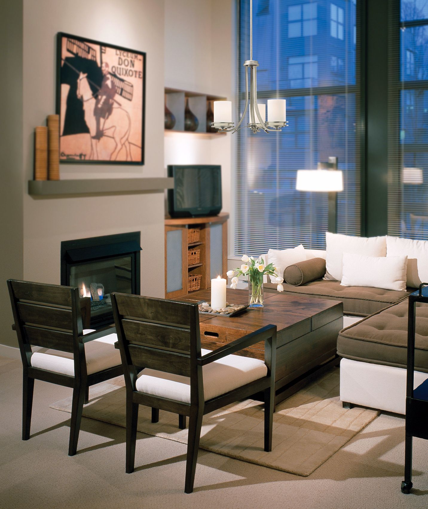 - Hendrik three-light chandelier by Kichler. A small, compact design with three uplights.