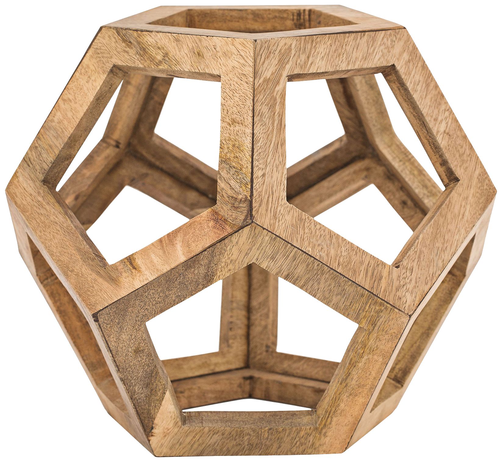 Beautifully hand-crafted from mango wood, this contemporary honeycomb orb sculpture features a chic, geometric design with pentagon shaped, faceted sides.