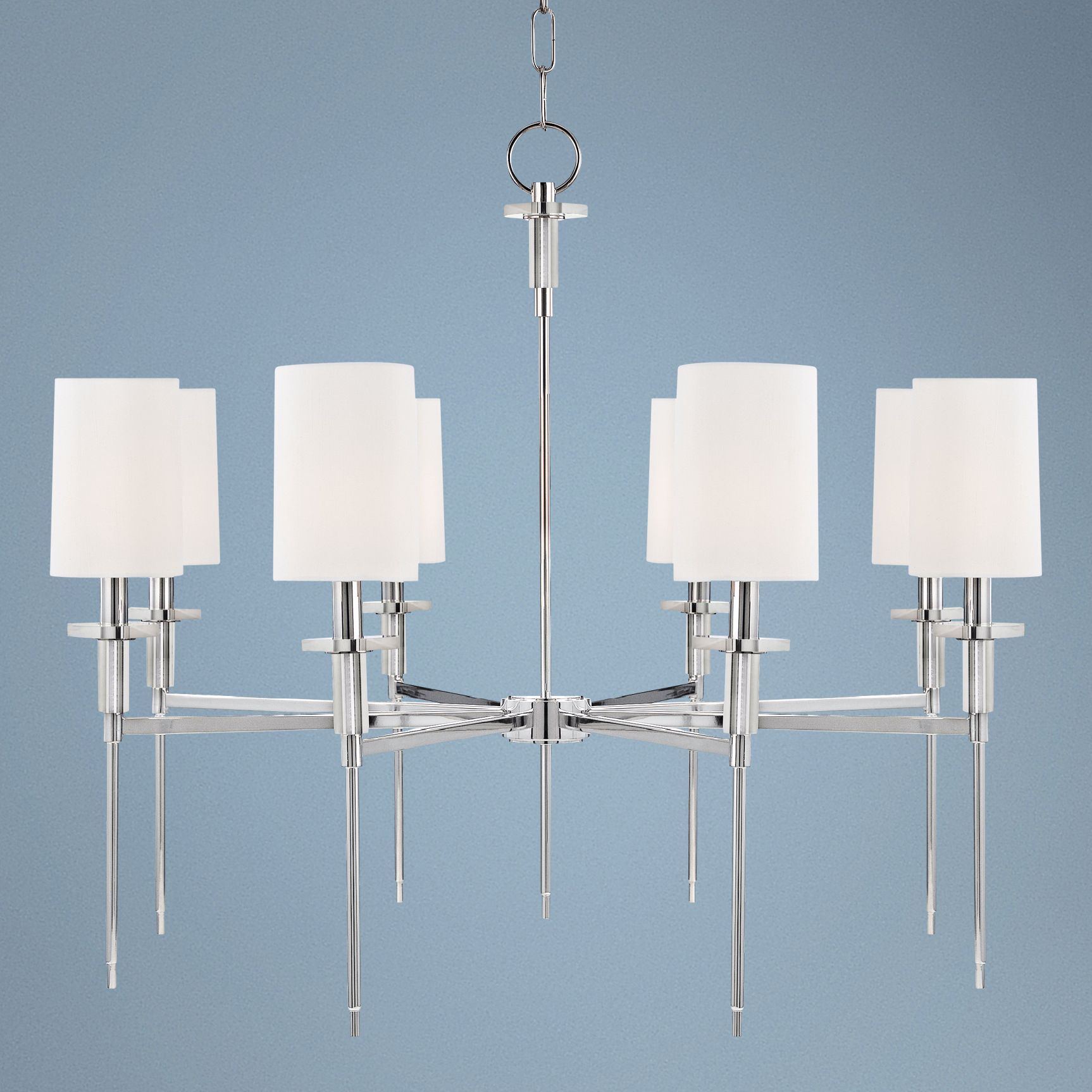 The Amherst collection from Hudson Valley Lighting offers a refined, sophisticated choice. The simple lines of this eight light polished nickel chandelier are classic, but the striking lines and minimal ornamentation feel modern. Smooth, off-white faux silk cylinder shades top each fixture and match the clean profile of this design.