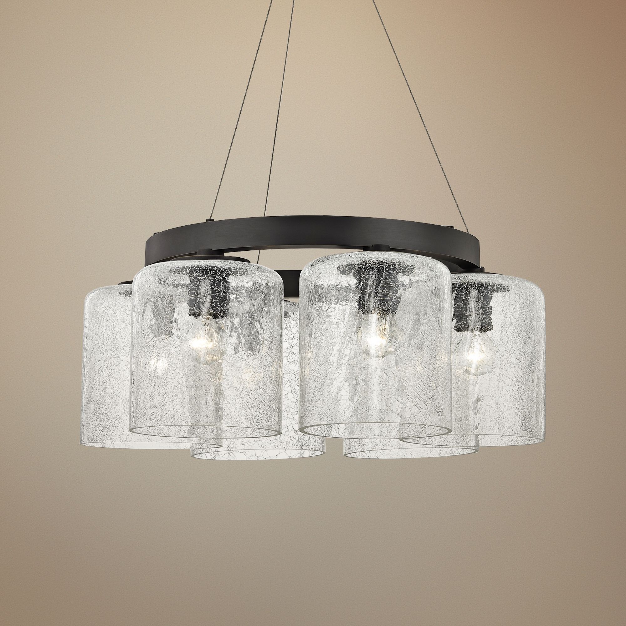 - Old bronze finish over steel construction. Crackel clear glass shades.
