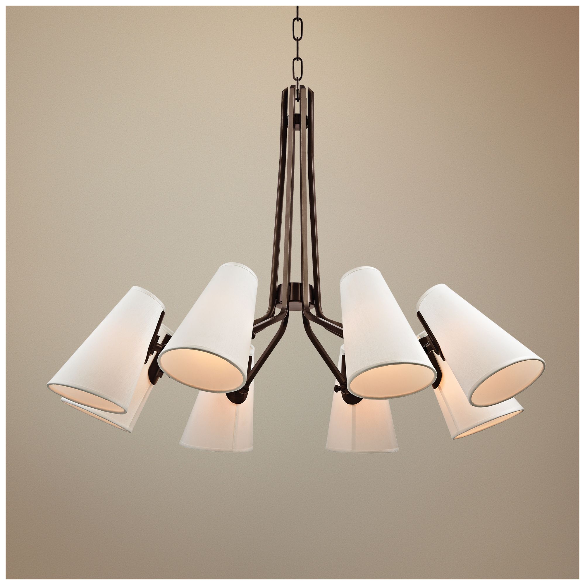 Fresh in its simplicity and mastery of contemporary style, the Patten chandelier by Hudson Valley Lighting embeds versatility of function into its very form. Each white glass conical shade can swivel from side to side and tighten the focus of the beam or project it further. On a square armed frame with an old bronze finish, the innovative lighting design radiates eye-catching brilliance. The Patten is an effortless and sophisticated look for the dining room, living room, or your modern entryway.