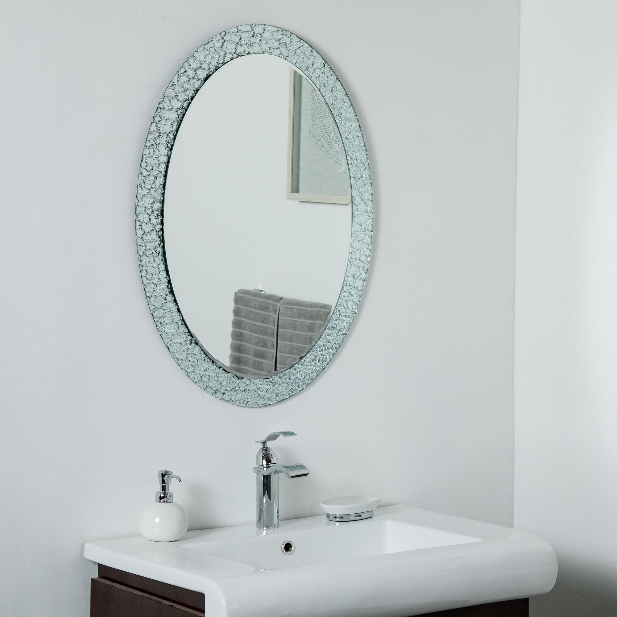 Gorgeous texturizing surrounds the oval silhouette of this sleek frameless wall mirror. Two layers of thick, strong float glass fashions a mirror with a center panel made from beveled, distortion-free glass. Ideal for bedrooms and living spaces as well, this oval bathroom mirror reflects a signature style whether mounted vertically or horizontally. All mounting hardware is included.