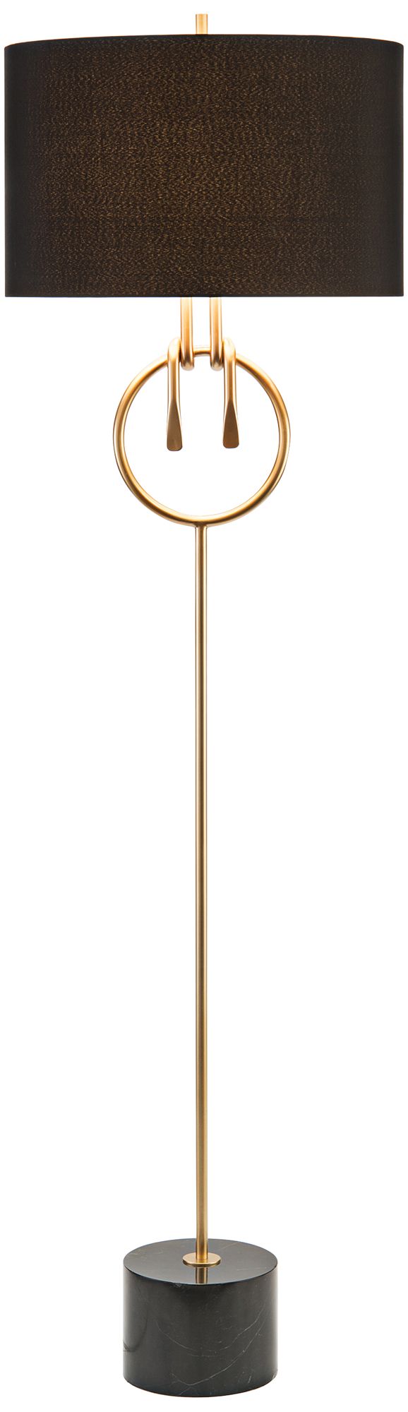 Tie this stunning floor lamp by John Richard into a stylish, sophisticated retreat. Its slim golden post boasts a striking knotted ring design. Anchored by a beautiful black marble cylinder block base, this lamp offers a glamorous lighting option.