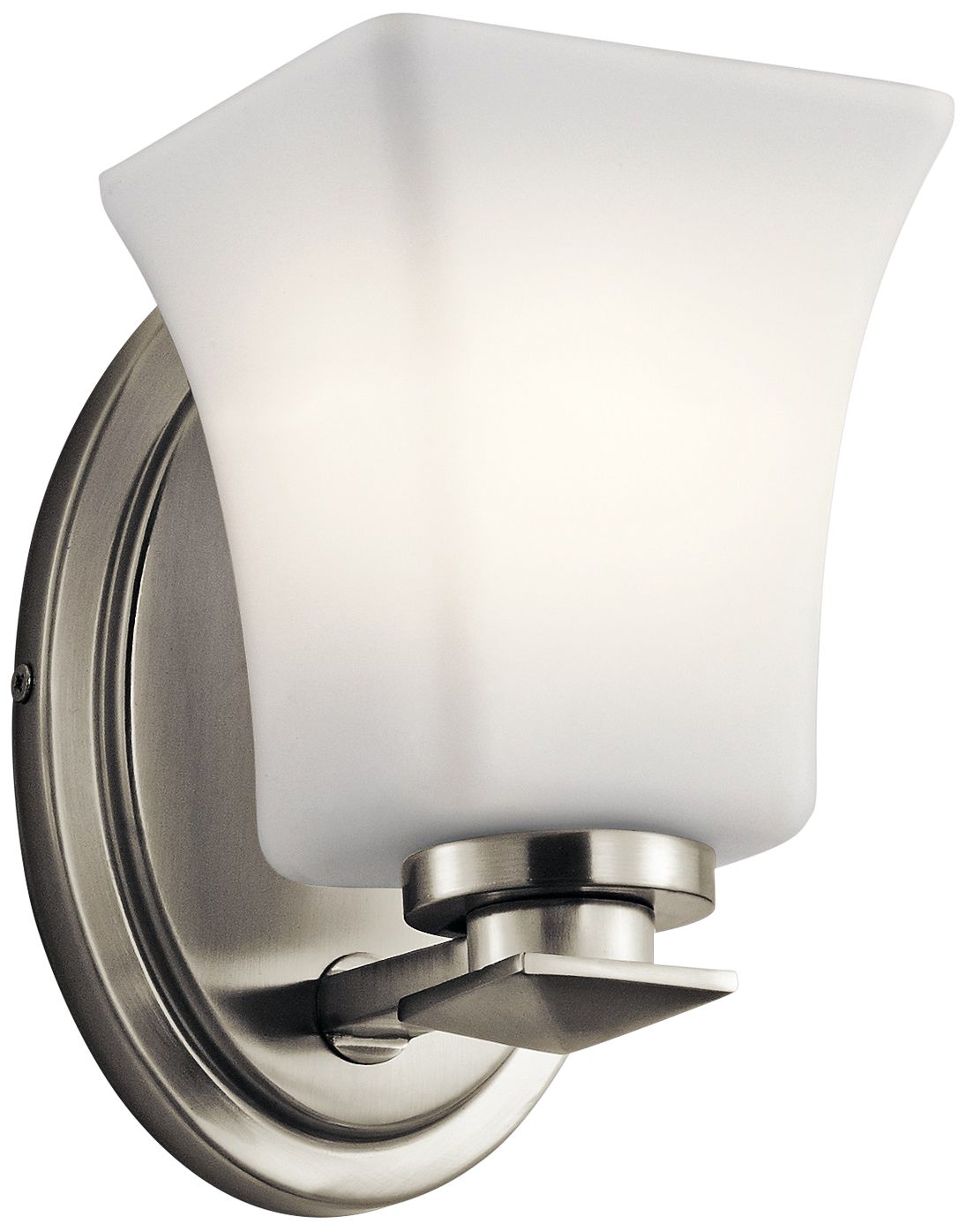 A cased and satin etched opal glass shade stands out as the focal point on this steel wall sconce by Kichler. Its metal frame is distinguished by a brushed nickel finish for contemporary elegance. To fit in with surrounding fixtures, it may be installed with its light pointing either up or down.