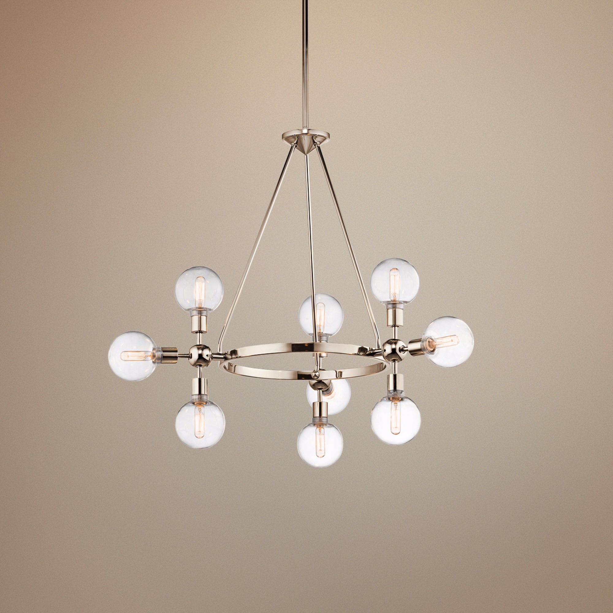 Nine clear glass globes form the striking contemporary style of this cluster pendant by the Garim Collection. Gleaming in polished nickel and an open center ring with easily configured light cluster for a bespoke look. From Kichler lighting design.