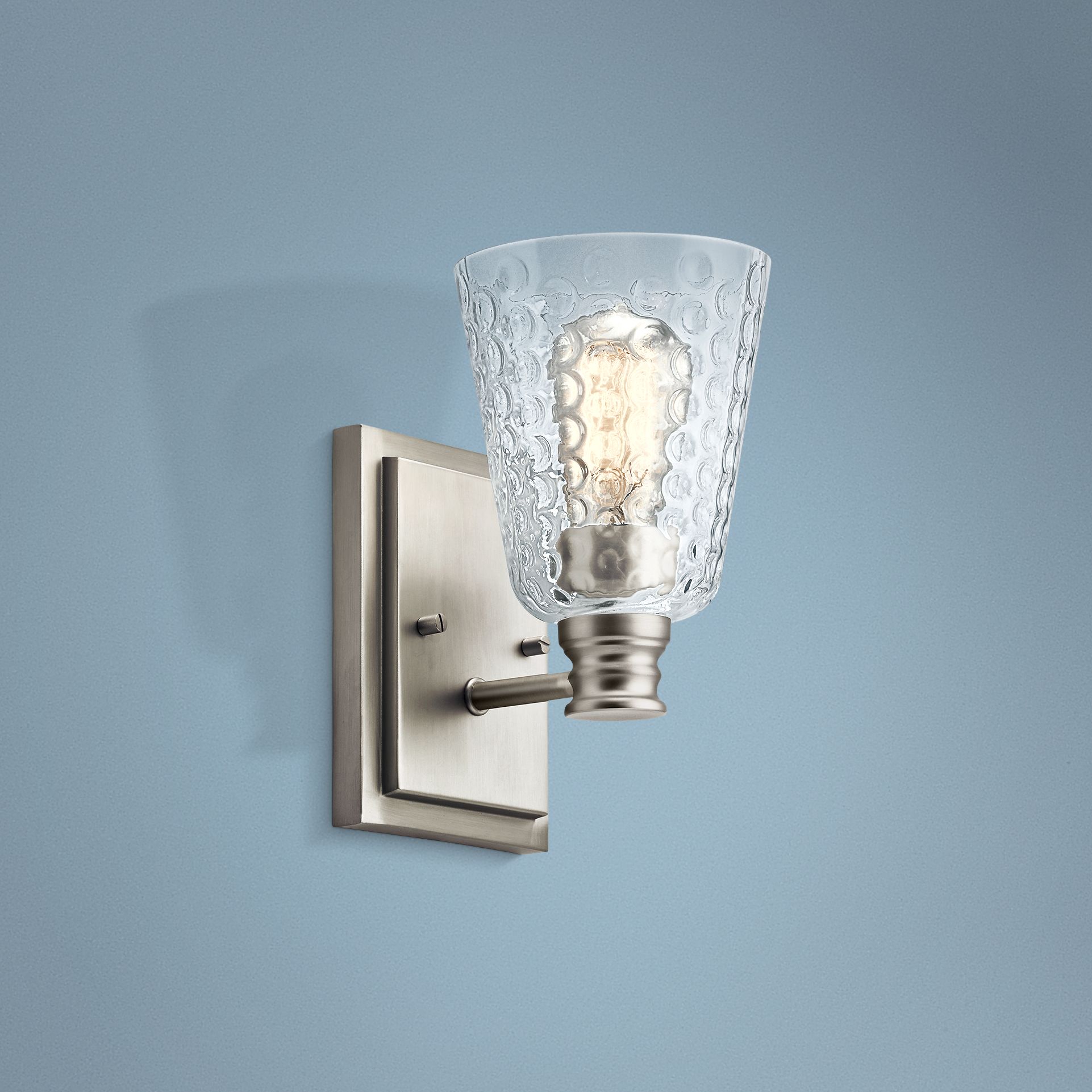 Brighten a hall space or nook with this stunning contemporary wall sconce from Kichler. This beautiful lamp is gorgeously trimmed with brushed nickel finish steel supports and topped with a clear glass shade decorated with a striking thumbprint design. It can conveniently be mounted up or down to meet the specific needs of any room.