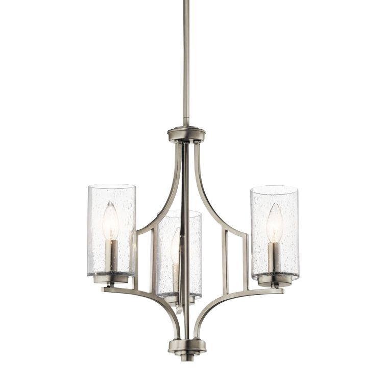This three-light steel chandelier by Kichler is give a lovely texture and personality from a brushed nickel finish. Its clear glass shades are subtly seeded to offer eye-catching detail. For convenience, it's sloped ceiling adaptable for reliability and versatility.