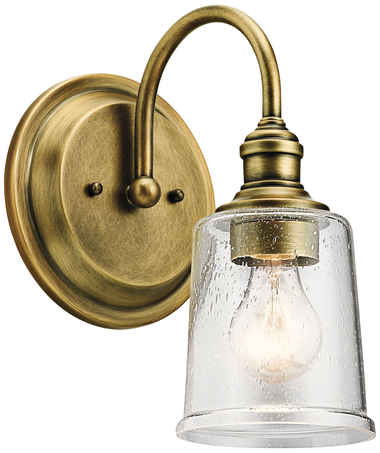 Warm a favorite nook with this elegant traditional wall sconce from Kichler. Made from natural brass finish steel, this stunning light features beautifully curved supports suspended from a matching, round back plate. A clear, seeded shade provides a gorgeous finishing touch. This fixture can conveniently be mounted up or down.