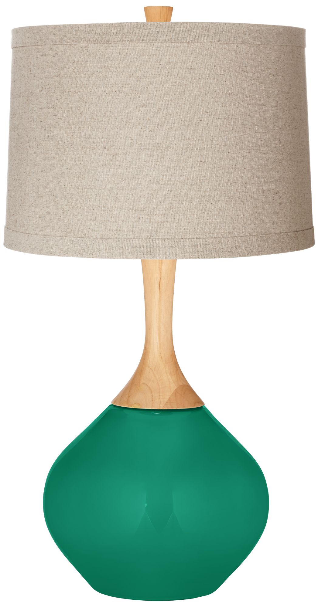 Beautify your home decor with the exquisite style of the Wexler Color + Plus™ table lamp. Hand-crafted by experienced artisans in California, the base features a beautiful Leaf green color tone that is elegantly complemented by the lamp's graceful wood lamp neck. A coordinating finial over the natural linen drum shade draws the look together and completes the design. Lamp base U.S. Patent # 8,899,798.