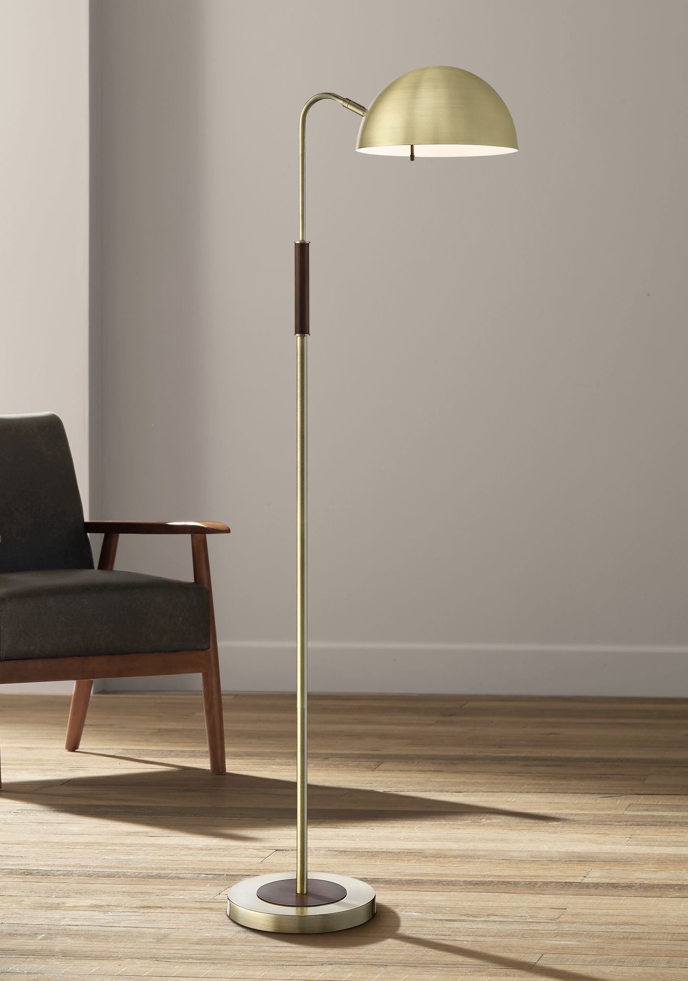 - Aged brass finish. Metal construction. Off-white linen shades.