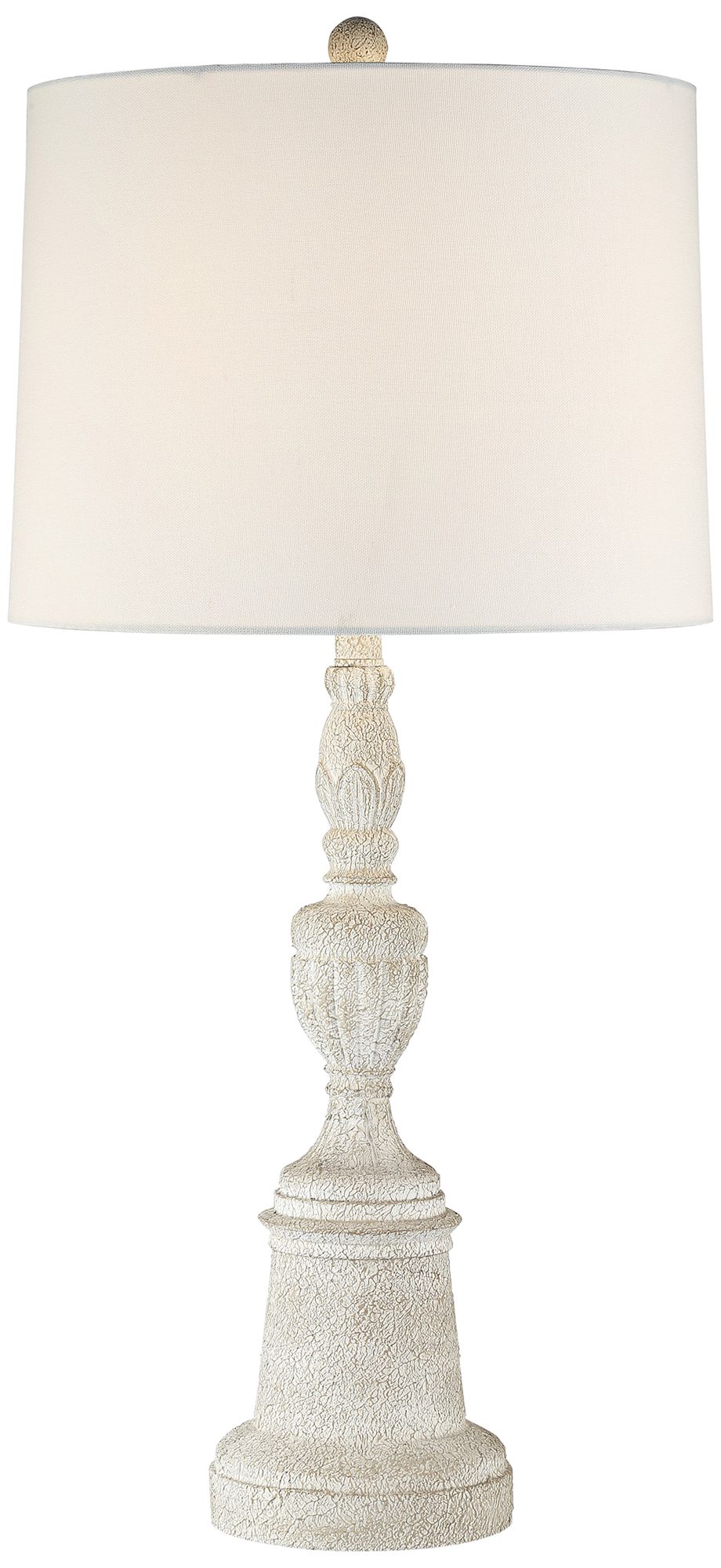- White finish. Polyresin construction. Fabric shade.