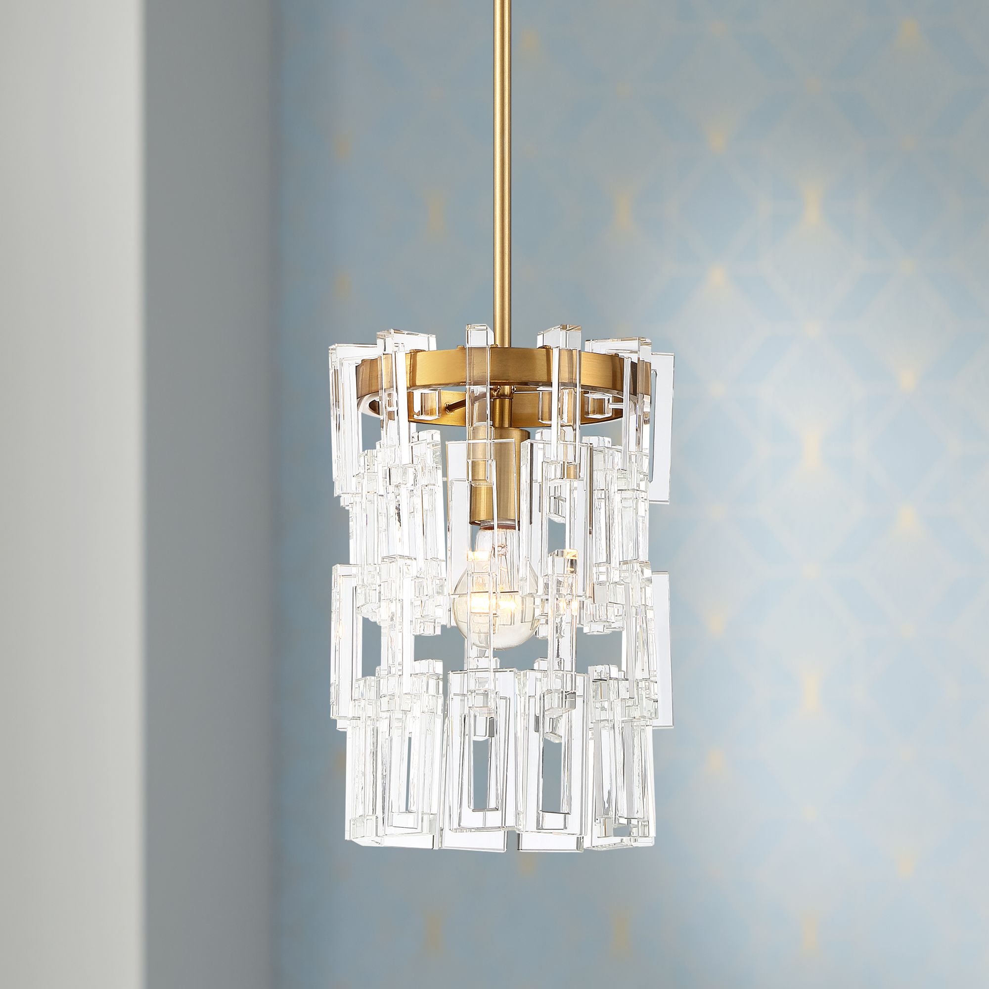 The luxurious design of this contemporary crystal mini pendant will bestow your home with a look of class and refinement. It comes in a burnished brass finish frame, which creates a wonderfully golden look. But the most notable feature is the shade, which consists of multiple rectangular glass crystal accents with center openings. The result is an elegant pendant light with a draping, geometric look.