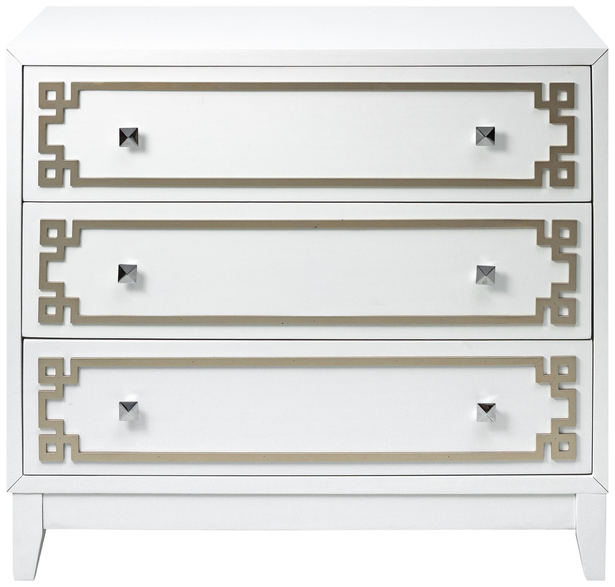 Add geometric flair and appealing storage space to a living area or bedroom with this three-drawer accent chest. Crafted in wood by Home Meridian, the chest features a painted white finish. Each of three drawer fronts are adorned with champagne finish geometric overlays that create beautiful detail. Brushed nickel drawer pulls add a final touch of elegant appeal.