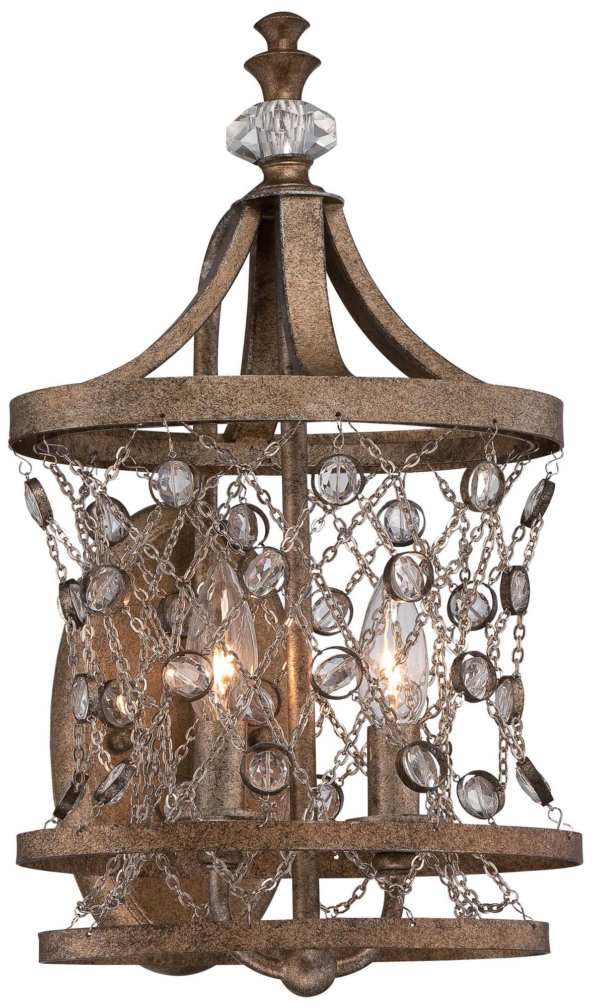 Ravishing aged Arcadian Gold finishes this regal metal wall sconce. Delicate criss-cross chain is adorned with sparkling crystal beads and a clear crystal accent tops off this fabulous 2-light design. A great look for your home from Metropolitan lighting.