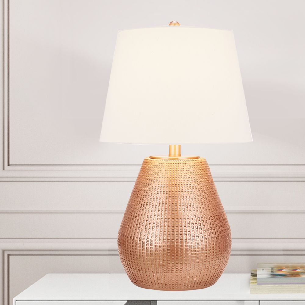 - Copper finish over polyresin construction. Chiseled detail carvings. Beige linen tapered drum shade with beige silken inner liner.