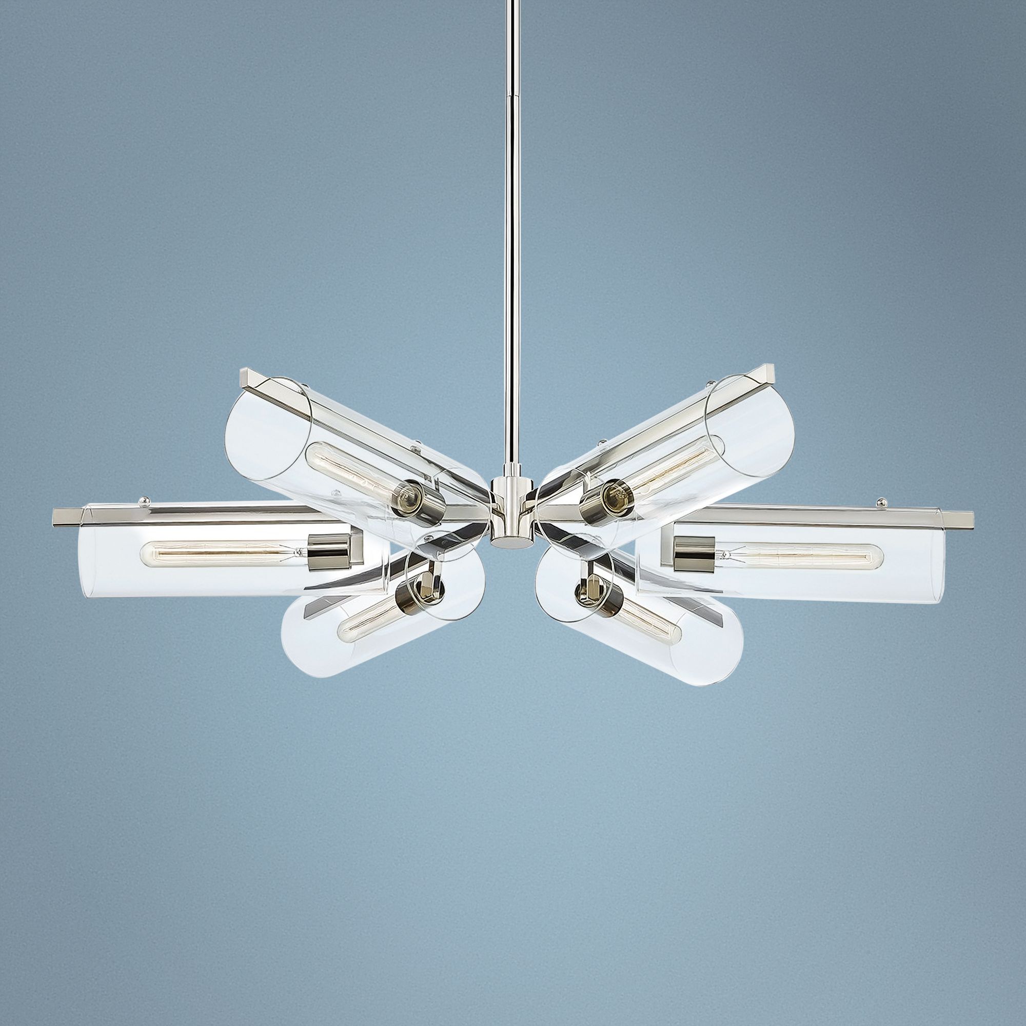The Ariel contemporary modern chandelier from Mitzi by Hudson Valley features sleek design with a polished nickel finish. The cylindrical glass shades and six bulbs are set into tall horizontal beams that extend in all directions. This fixture will add modern style to your space.