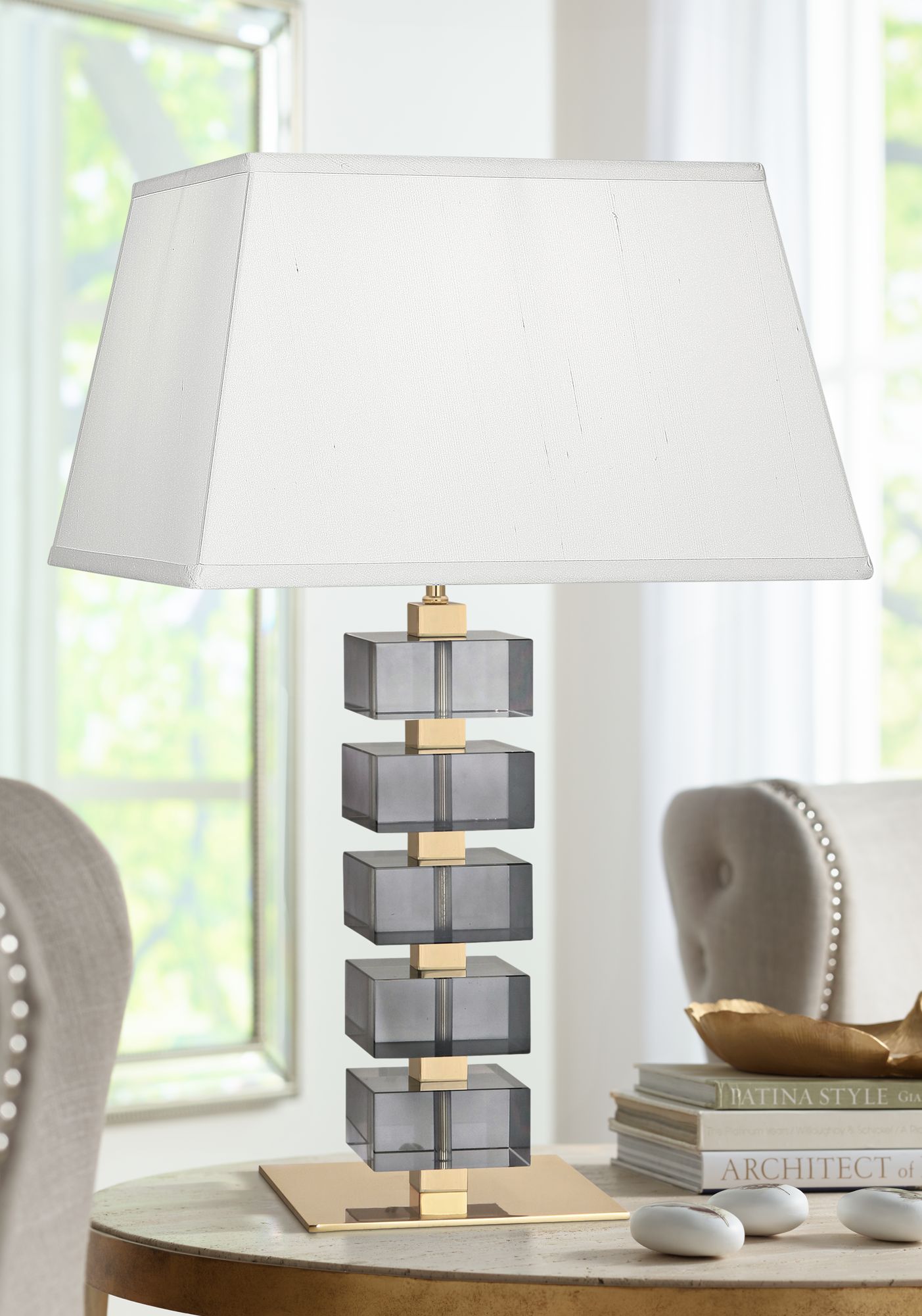 This elegant stacked block geometric table lamp is brought to you by celebrity designer, Jonathan Adler for Robert Abbey. Crafted from steel in a lacquered natural brass finish, it's complete with intriguing smoke acrylic crystal blocks in a stylish, stacked design. An off-white silk rectangular shade tops it off in spectacular fashion.
