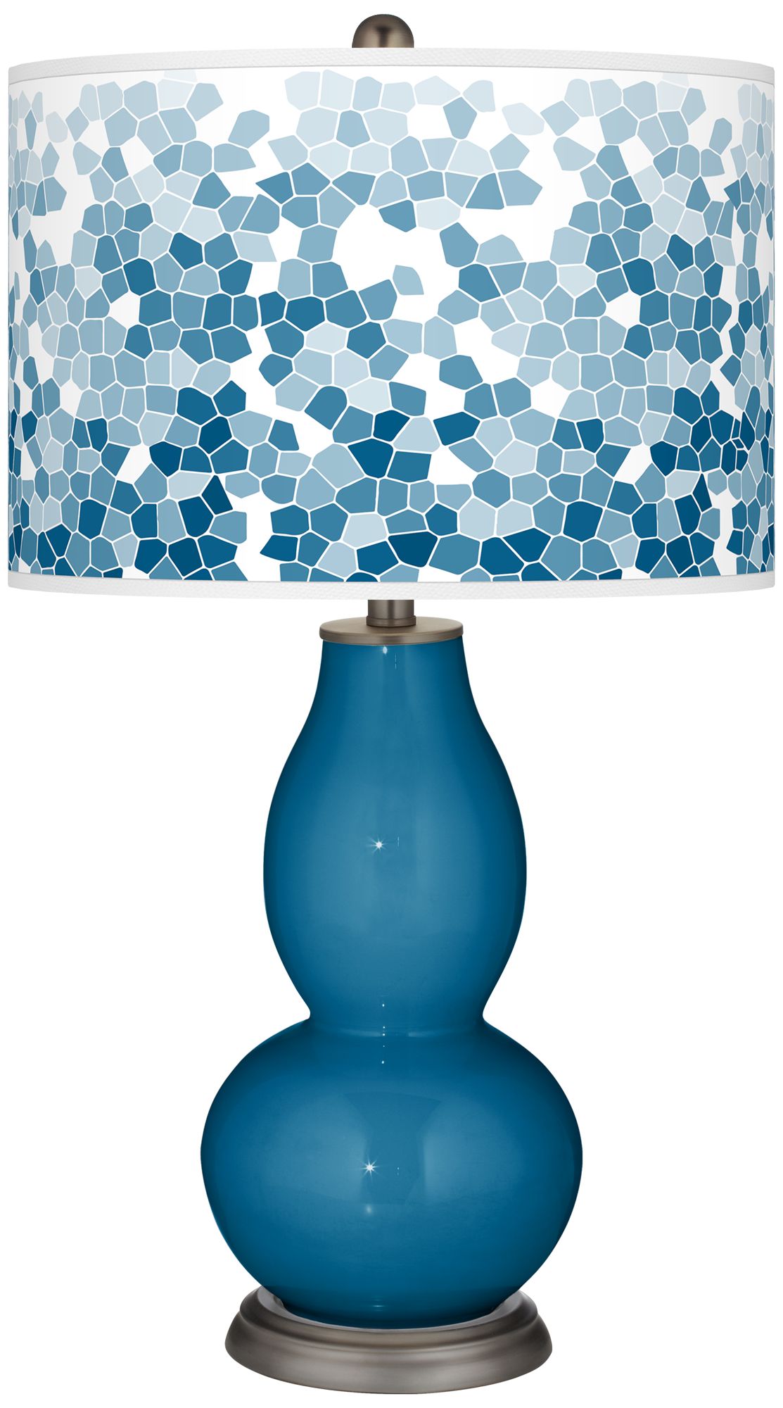 This double gourd glass table lamp from the Color + Plus™ collection offers a brilliant color accent for your home decor. The designer Mykonos Blue base is hand-crafted by our experienced artisans in California, and is topped by a custom-made lamp shade. The shade features an exclusive Mosaic pattern and is printed to order. Shade process U.S. Patent # 7,347,593. Lamp base U.S. Patent # 8,899,798.