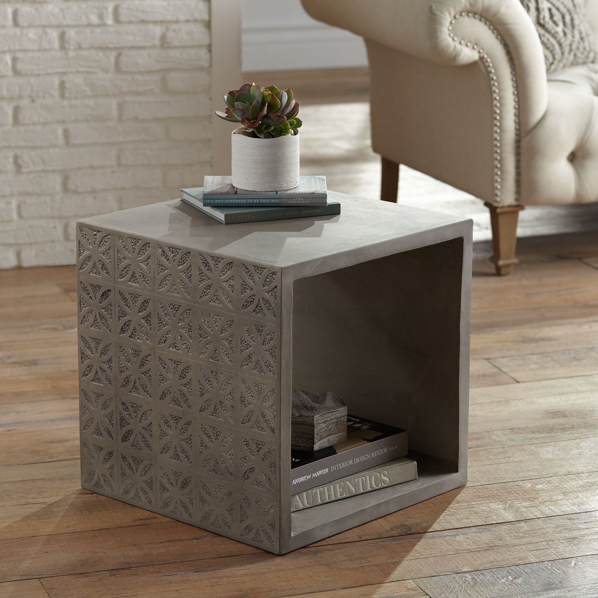 Incredibly versatile, this concrete side table can be used as a bedroom end stand or a decorative garden accent. The sealed cement construction makes it suitable for both outdoor and indoor use. With an open cube shape and clean-cut lines, this table provides a stylish modern look for any setting, and the floral pattern imprints on the sides add a touch of lively style to an otherwise minimalist design.