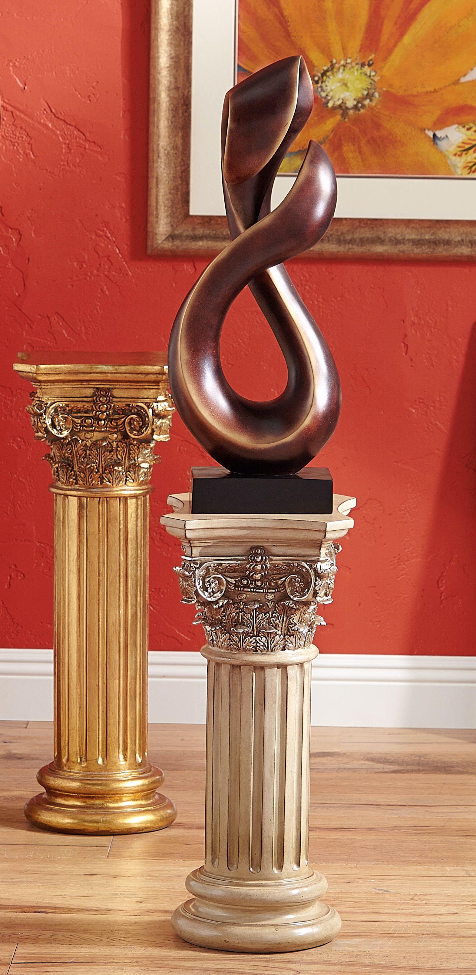 Finished in a lustrous dark gold, this handsome spiral art piece is an open-ended infinity symbol. Fashioned out of polyresin and set upon a black stand, it is sure to make a big impression on your home decor. Display on a table or a small pedestal in most any room for the feel of a contemporary art gallery.