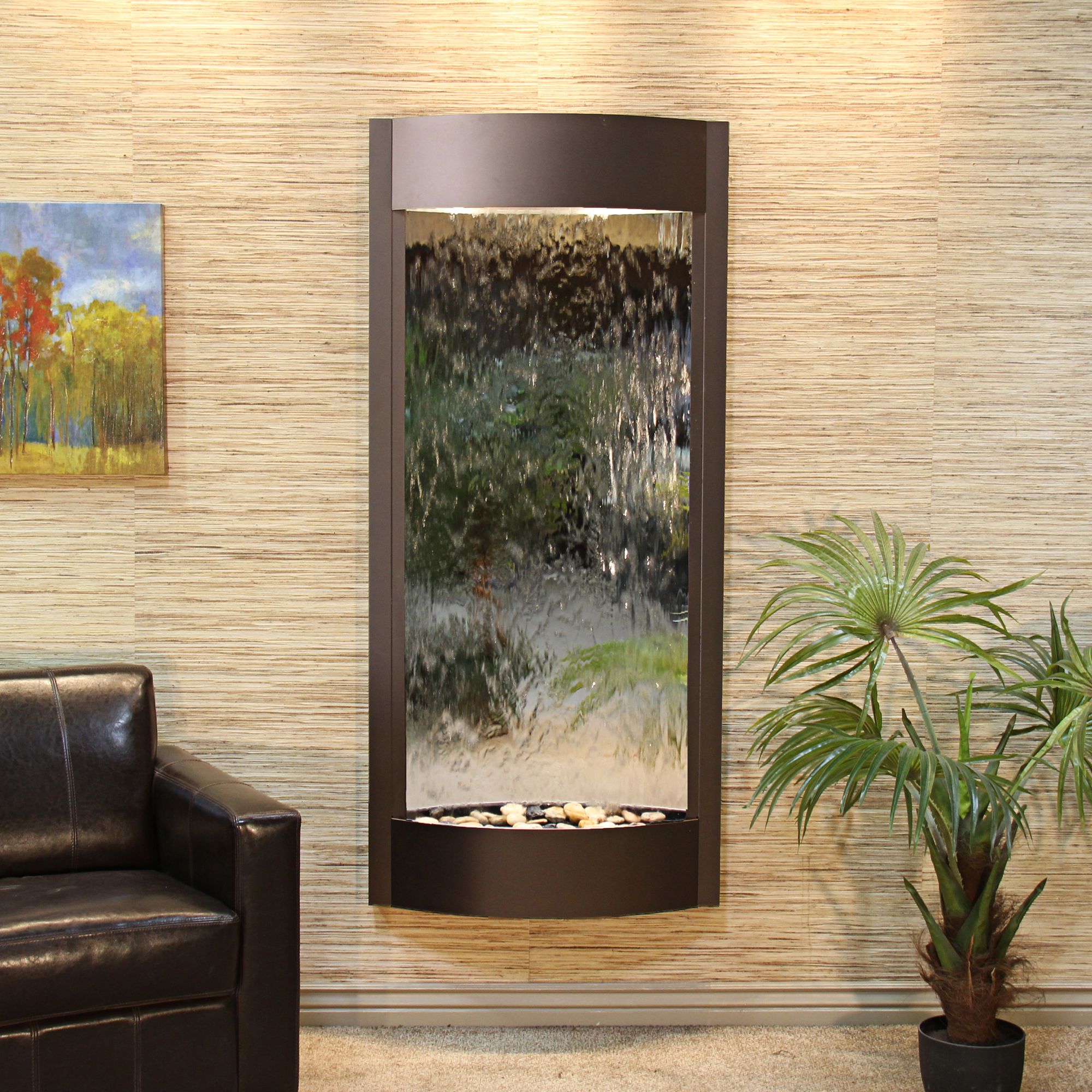 Bring nature into your decor with this stunning antique bronze and silver mirror indoor wall fountain. From the Pacifica Waters collection, this soothing fountain features an appealing half-moon shape with a fully framed hood and tray edges. Halogen lighting creates wonderful ambiance. The fountain offers a 1.5 gallon water capacity, with polished river rocks, a pump, and easy installation instructions included.