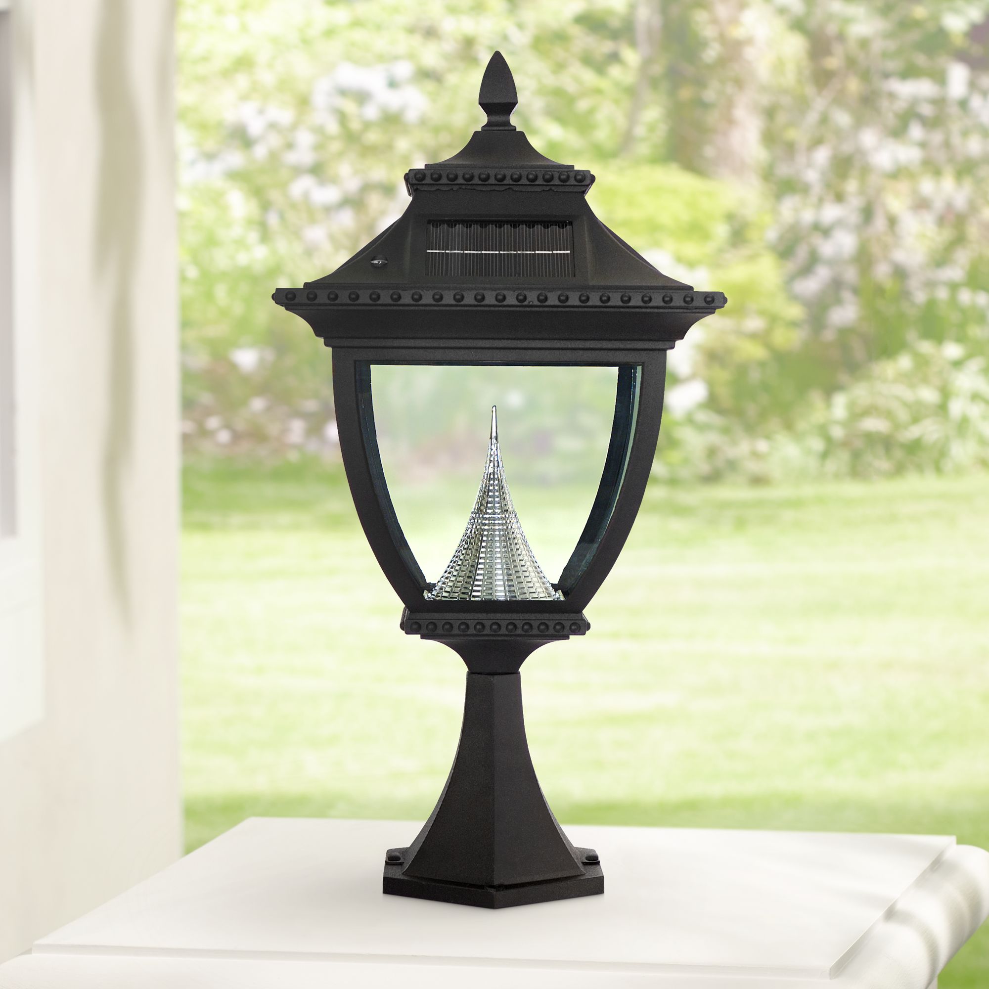 - Black finish solar pier mount light.