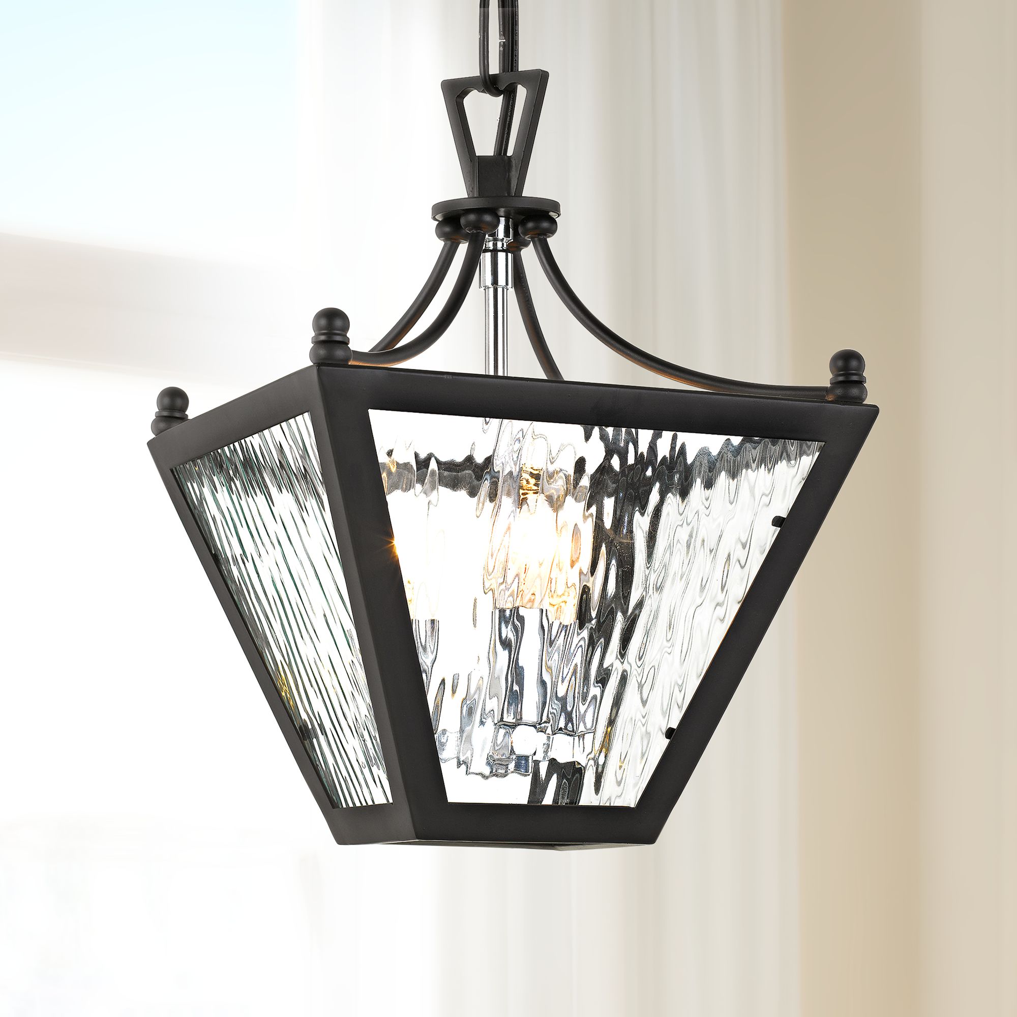 Go with a charming traditional village motif when lighting a compact space. This three-light mini-lantern pendant from Crystorama offers a slight industrial feel with a matte black and polished chrome finish over steel construction. Romantic soft watery glass panels create a textured, romantic touch.