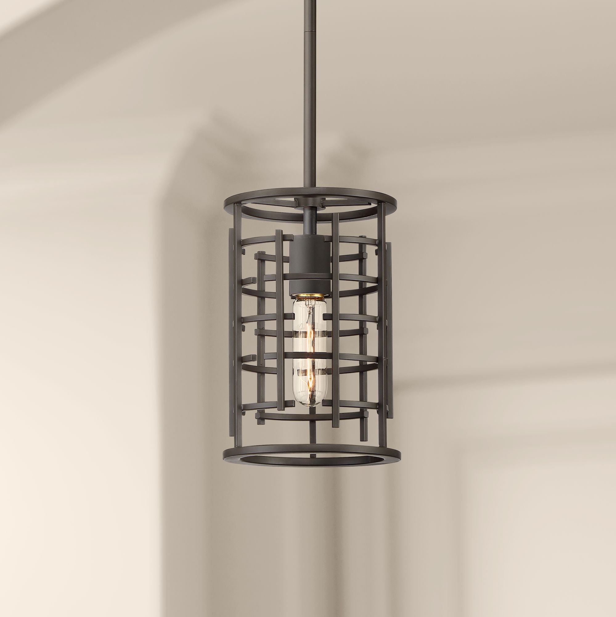 Unusual styling makes this mini pendant light an attractive design for your home. It comes in a cylinder-shaped open cage frame, with uneven intersecting lines that create a curious geometric look. A smooth bronze finish covers the steel frame to provide a uniformly handsome look to this transitional pendant light. A great addition to a kitchen counter or bathroom space.