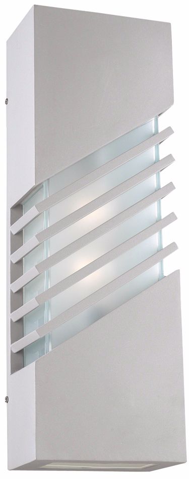 A large outdoor wall light can help transform your home's exterior into a modern showplace. This handsome silver finish accent features a metal face with diagonal cut-out design that lets the light out. Inside the contemporary housing, the light is diffused by beautiful acid frost glass. This outdoor wall fixture is UL listed for wet locations.