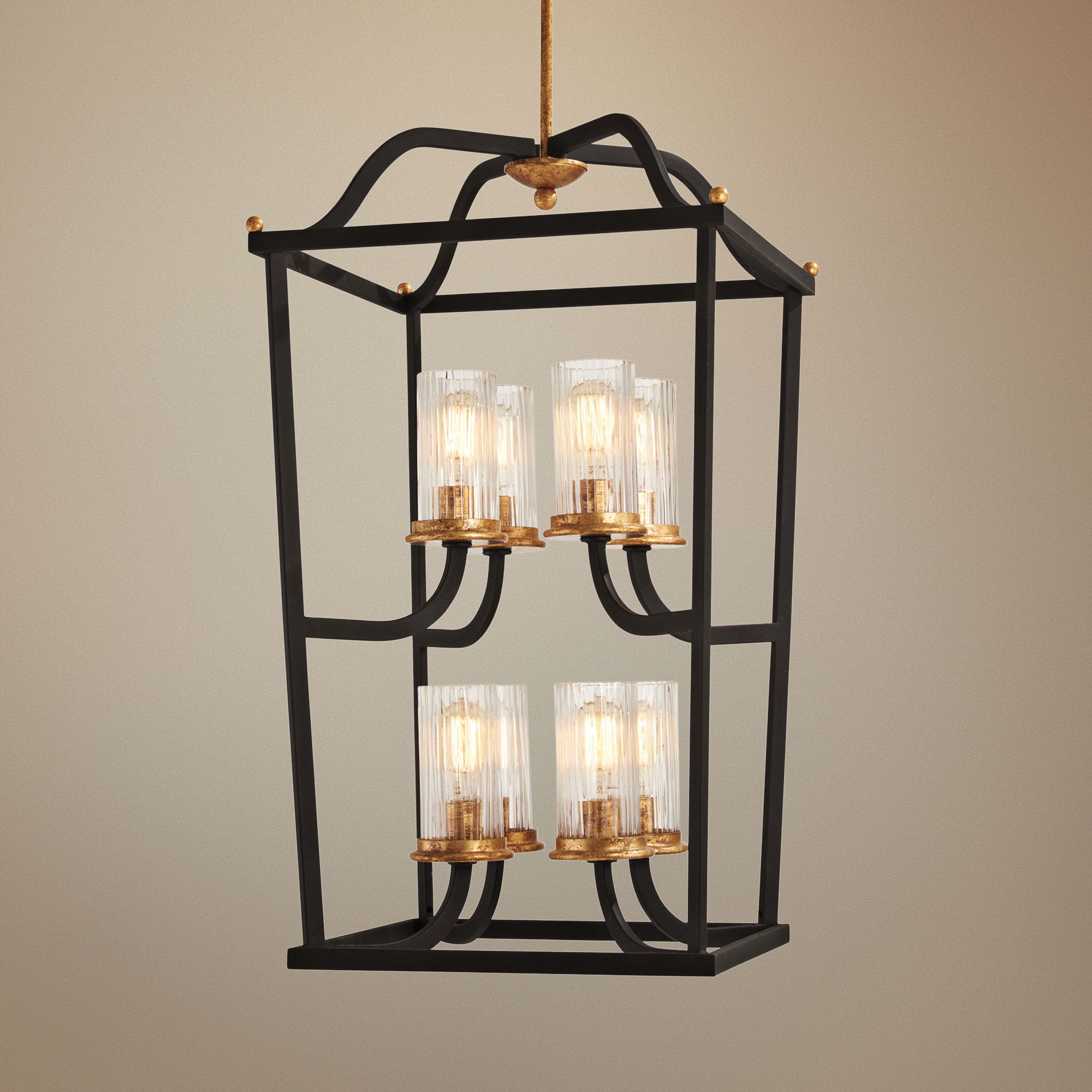 Minka Lavery's Posh Horizon collection truly lives up to its name with its sleek, stylish design. Elegant clear ribbed glass shades are surrounded by a handsome steel frame in a sand black and gold leaf finish. Opulent yet refined, this eight-light pendant looks exquisite in a home office or library.