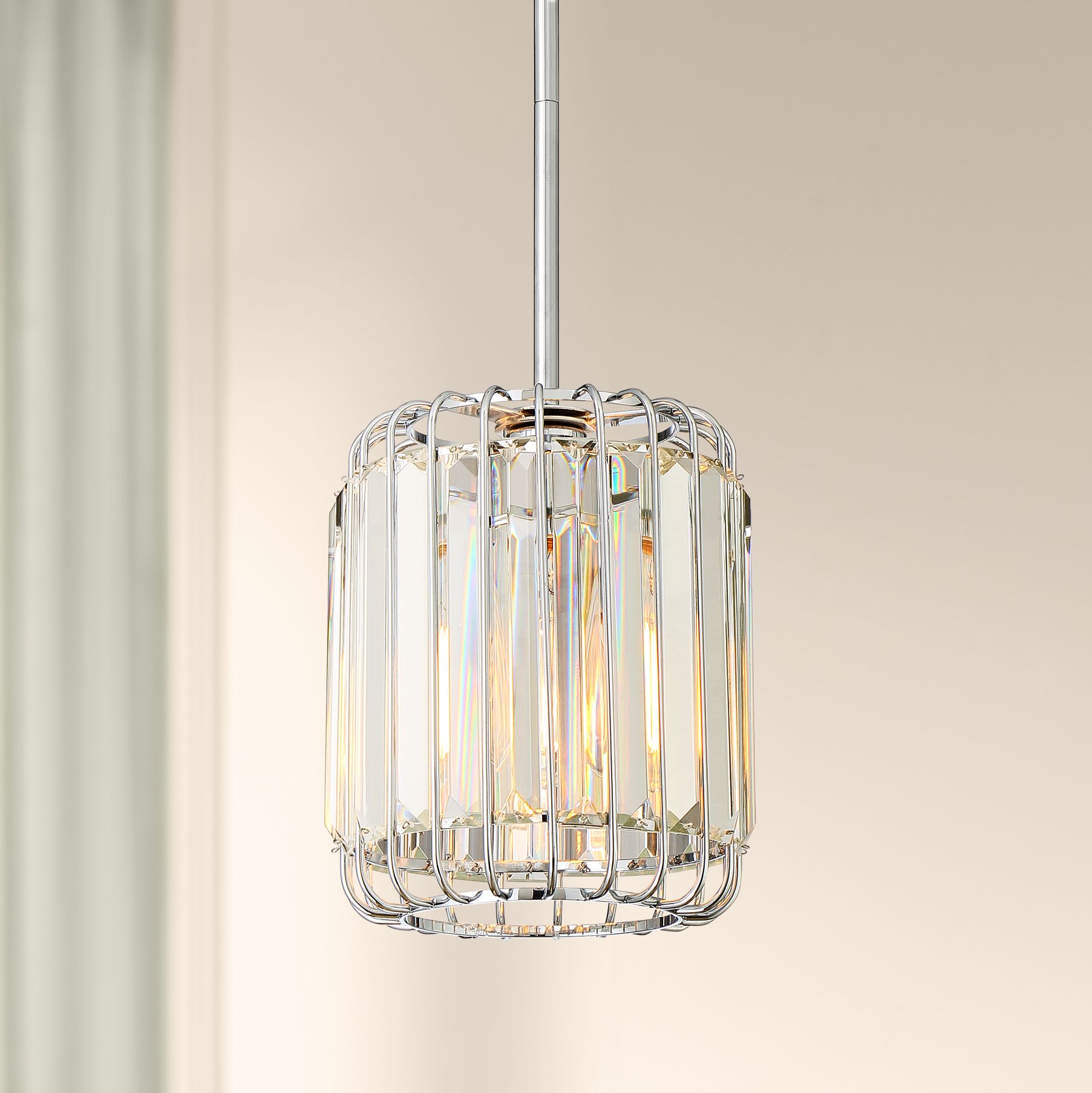 Gorgeous crystal rods create a luxe look and feel for this polished nickel mini pendant design. Beautiful alone or in series, this pendant is just right for the elegant contemporary home. It features quality K9 crystals and a polished nickel finish that gleams in the light.