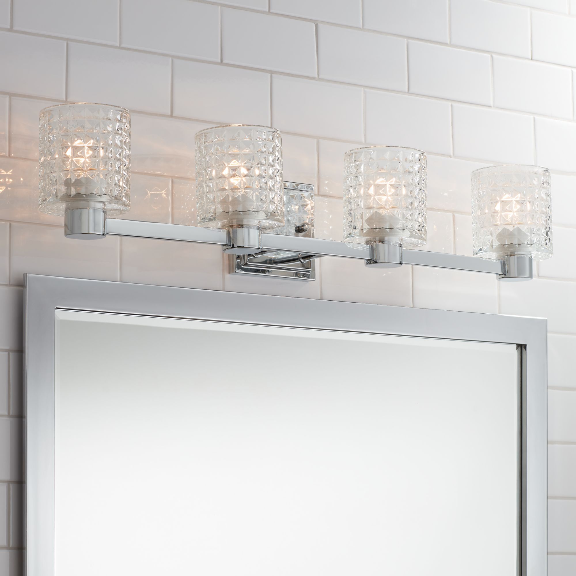 Use this modern bath light on any wall that needs a sophisticated upgrade. The textured diamond cut glass diffuses the illumination from the four bulbs. Chrome finishes on the linear hardware and backplate complete the look.