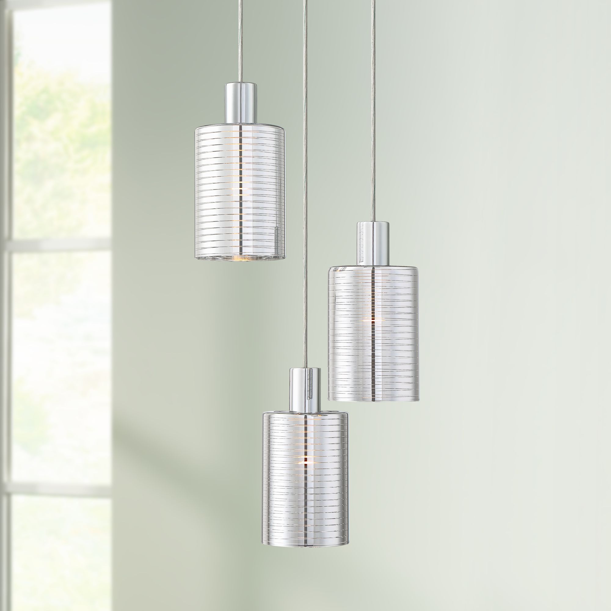 From the exceptional artisans at Possini Euro Design®, this chrome three-light pendant is an eye-catching choice. Boasting three vacuum-plated silver mouth-blown glass shades, further enhancement is created with carved horizontal stripes that create an element of texture. Accent a bedroom or bring modern character to a living area.