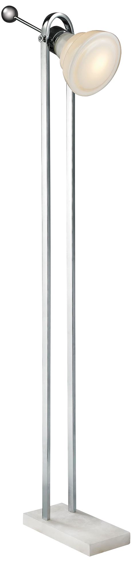 A sleek floor lamp inspired by turn of the century pendant and industrial design lighting. An adjustable opal white glass shade features a ball handle to direct lighting where needed. Constructed in polished nickel finish metal and completed with an alabaster stone foot, this versatile floor lamp ups the design ante in any room.