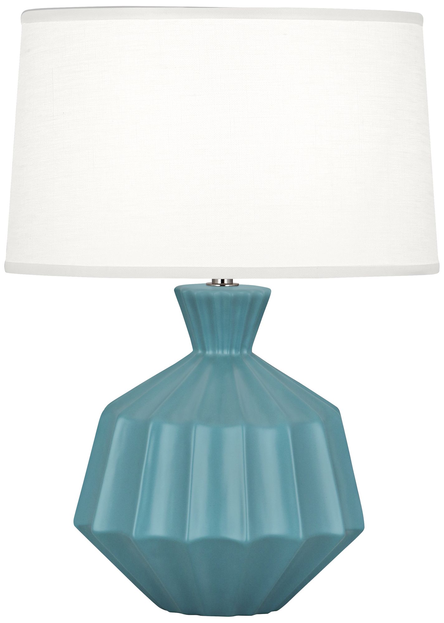 Beautiful matte steel blue finish enhances the contemporary appeal of this ceramic accent lamp from Robert Abbey. Its overall round shape has a faceted silhouette and fluted surfaces that lend a jewel-like quality to the design. Topped with a simple, crisp oyster linen drum shade that keeps the focus on the elegant base below.