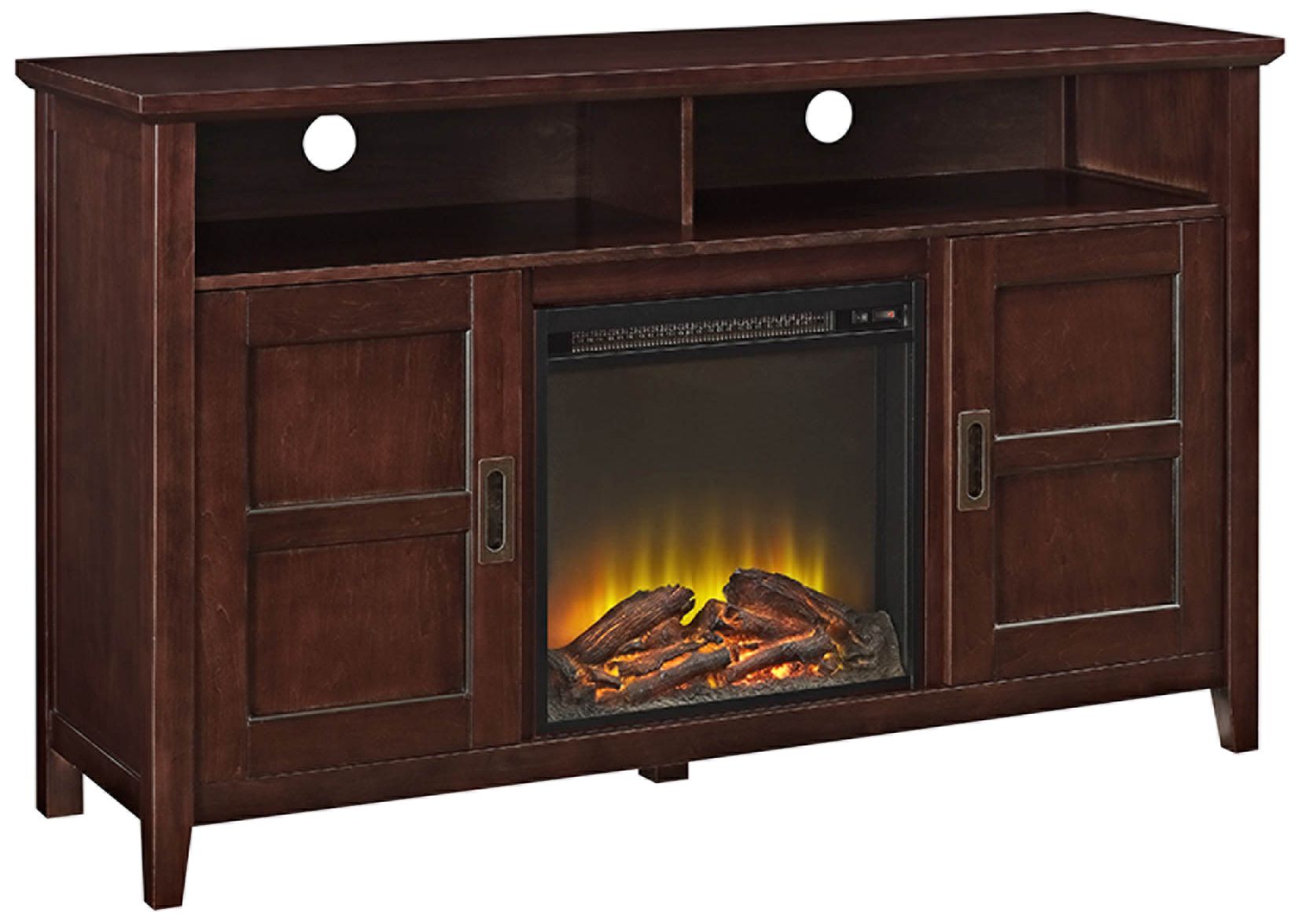 The coffee finish covers this Rustic Chic two-door fireplace TV stand from Walker Edison beautifully to highlight the natural details in the design. With adjustable shelves, you'll be able to conveniently accommodate all of your belonging and media components. The concealed and open storage will prove to be useful for convenience.