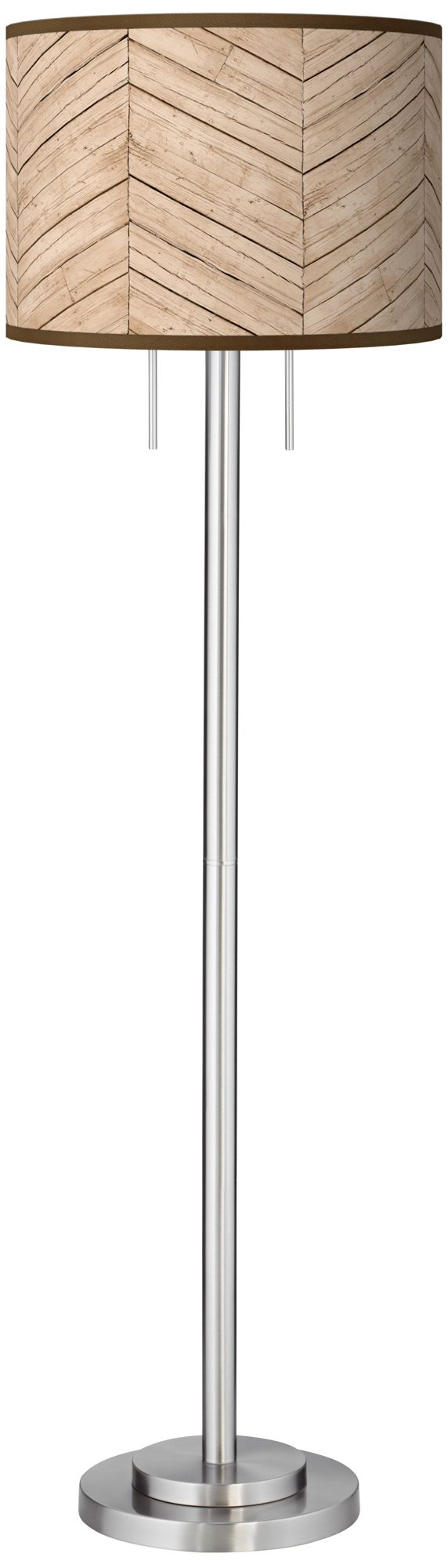 The Garth brushed nickel finish floor lamp takes a simple base design and pairs it with a striking printed drum shade for a burst of style. The shade design is custom made-to-order and features an exclusive Rustic Woodwork pattern. Shade printing process U.S. Patent # 7,347,593.