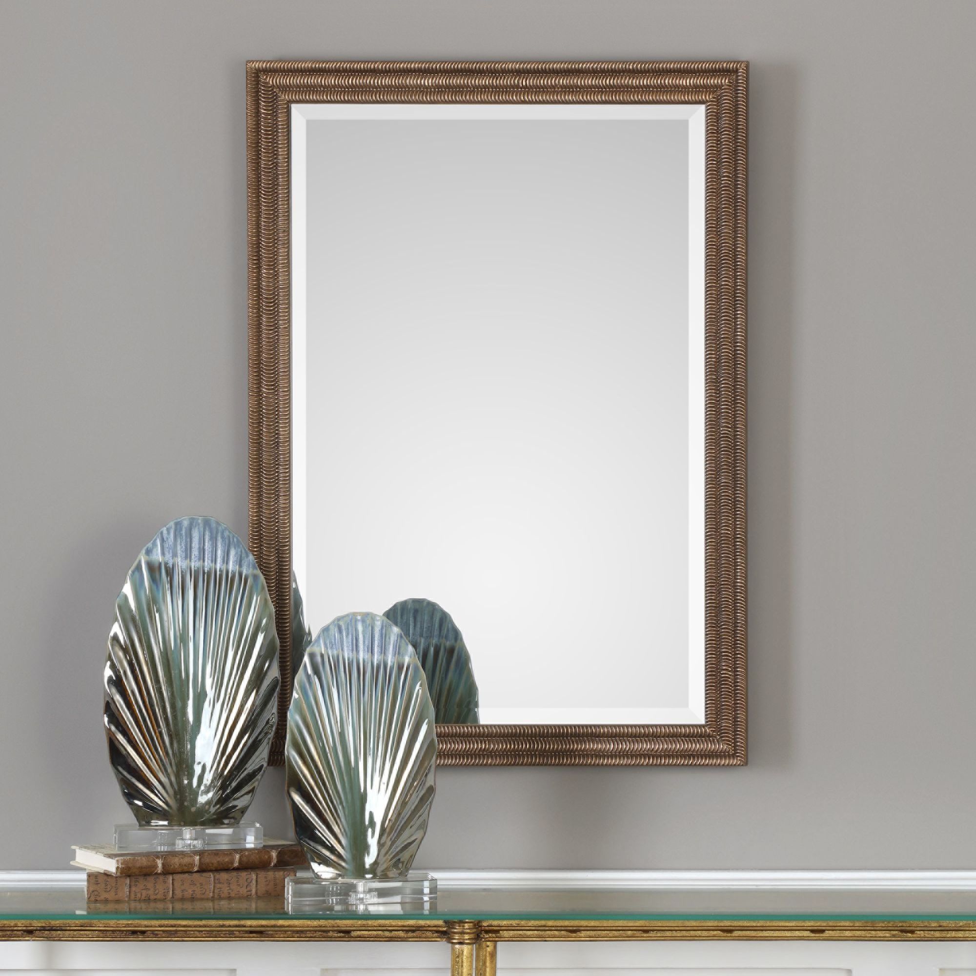 Offer traditional elegance to any decor with the addition of this rectangular wall mirror from the Uttermost Rydal Mirror collection. A lightly distressed bronze finish with gold undertones and layered texture design distinguish this fixture with eye-catching style. For convenience, this mirror can be installed either vertically or horizontally, allowing for it to easily accommodate any setting.