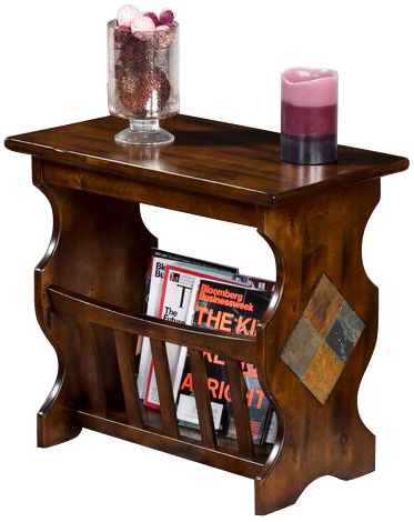 Beautiful styling and a bold finish add drama and luster to this attractive magazine table. Tasteful natural slate accents dress up a piece that offers convenient media storage as well as a surface for display. This dark chocolate birch wood magazine table fits perfectly in a traditional setting.