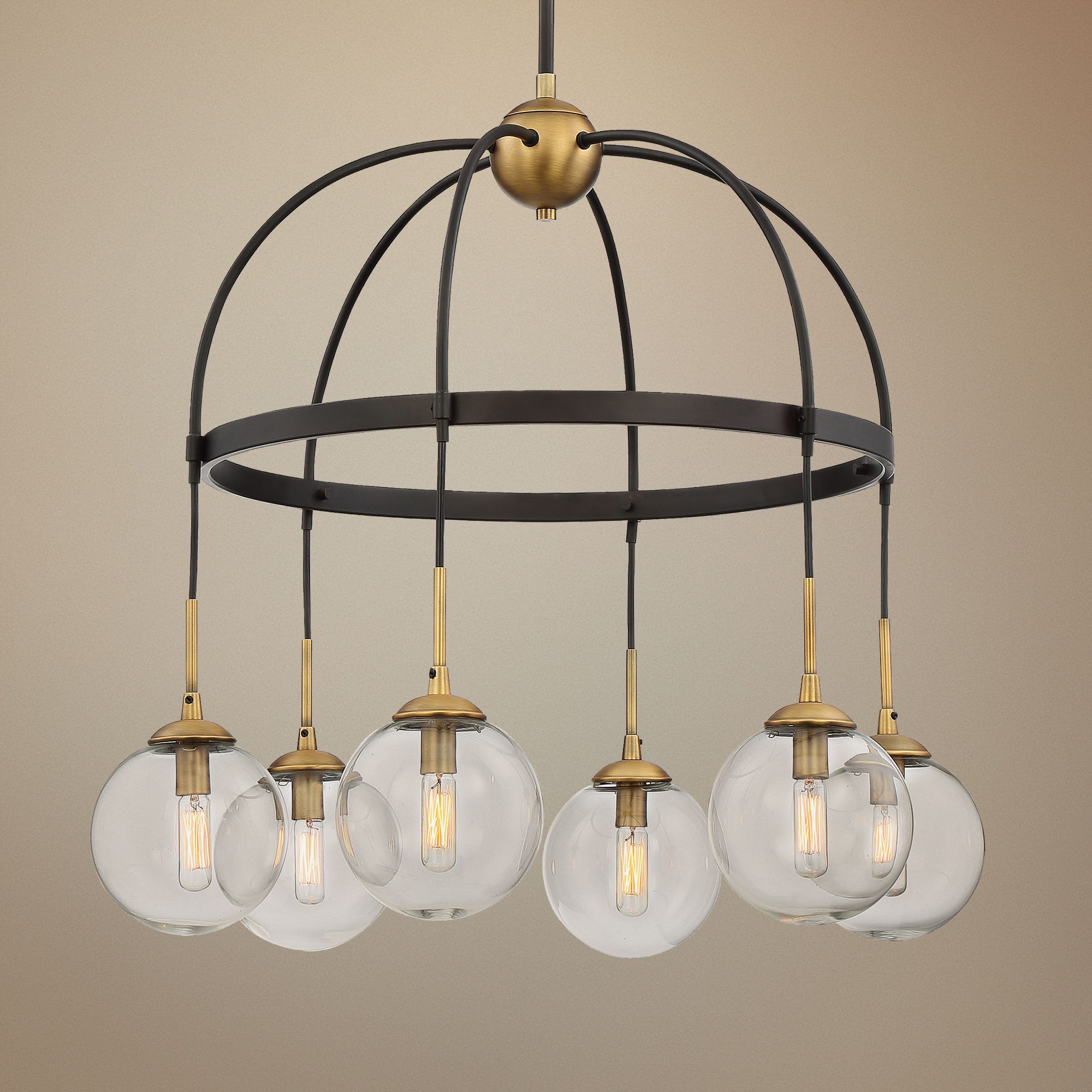 This beautiful two-tone, round chandelier from Savoy House has a decorative open-cage style metal frame. Finished in English bronze with warm brass details, its six lights within clear glass globes can be individually adjusted up and down for height. Vintage style Edison tube bulbs are recommended for this eye-catching fixture.