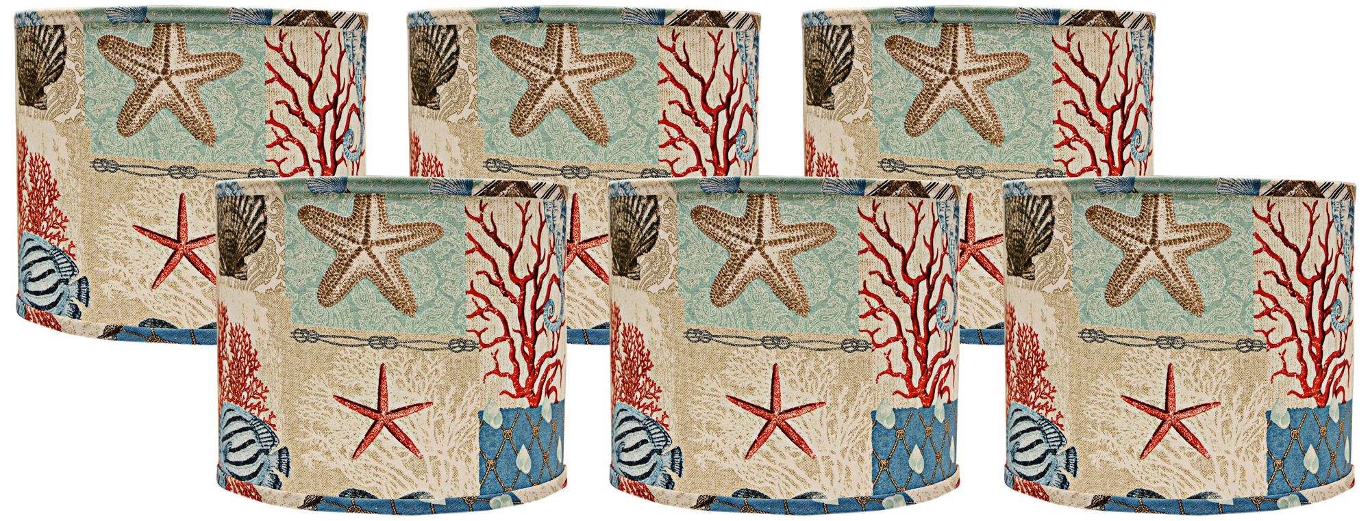 Express your love of the beach and summer with this set of six lamp shades. A patchwork design with coastal images add a pop of color.